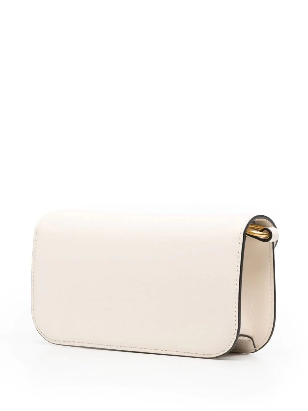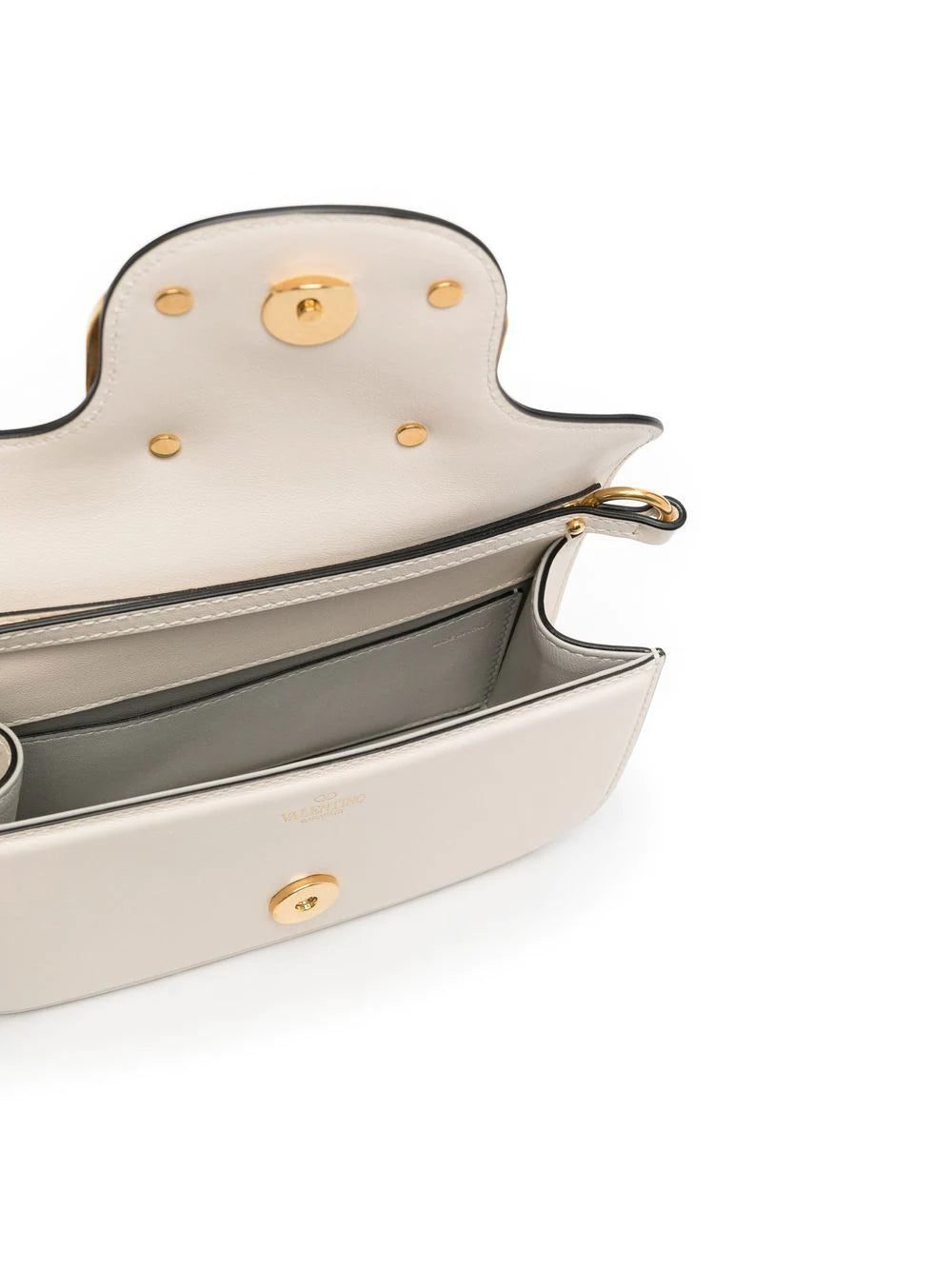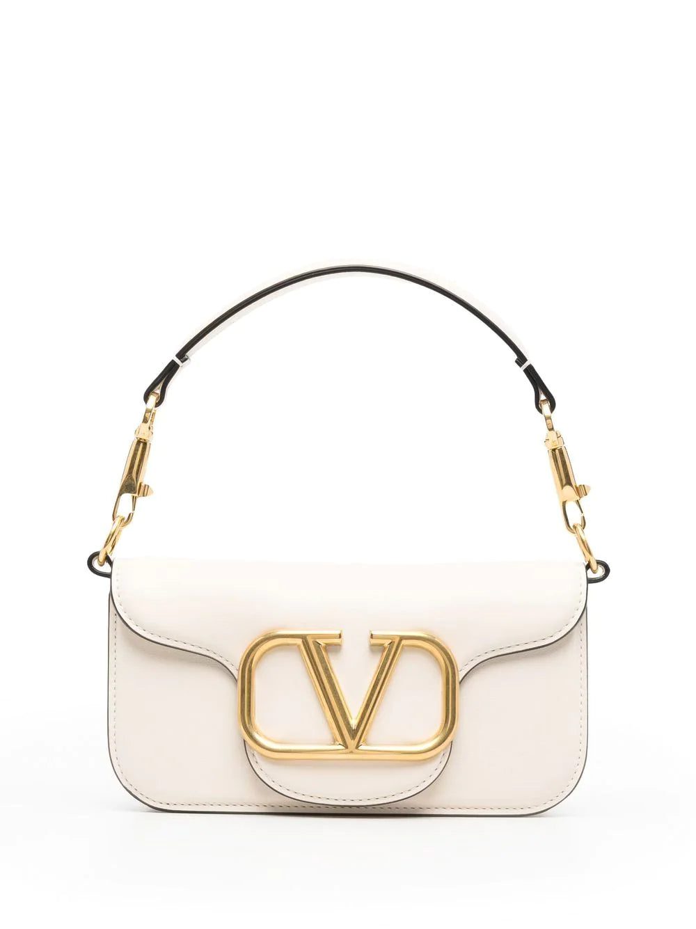 Arriving in a compact leather construction, Valentino Garavani's Locò bag stands out with the iconic VLogo Signature plaque. Here displayed in polished gold-tone hardware, it creates a refined contrast with the ivory-hued background.