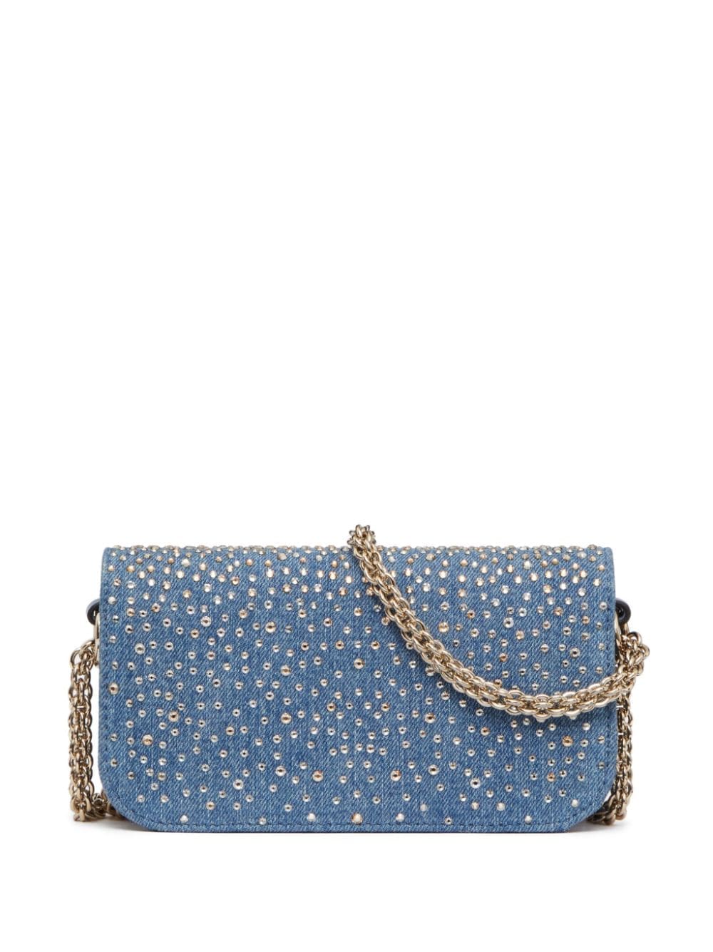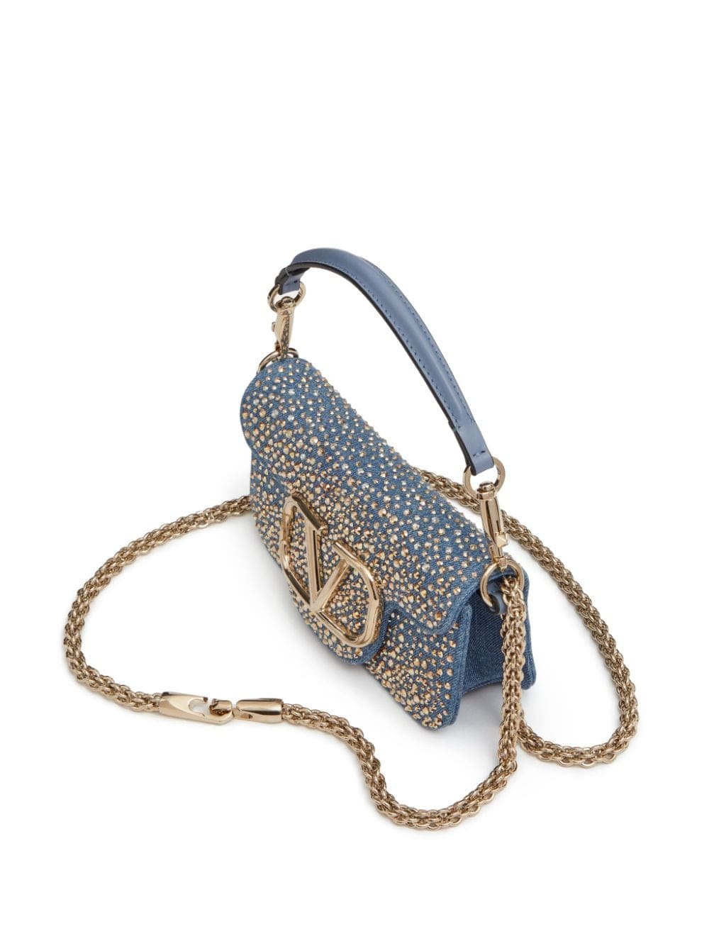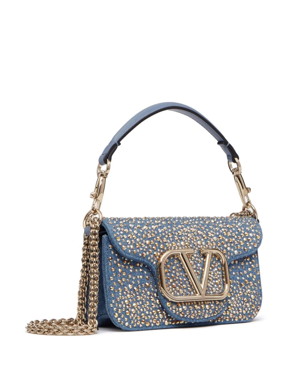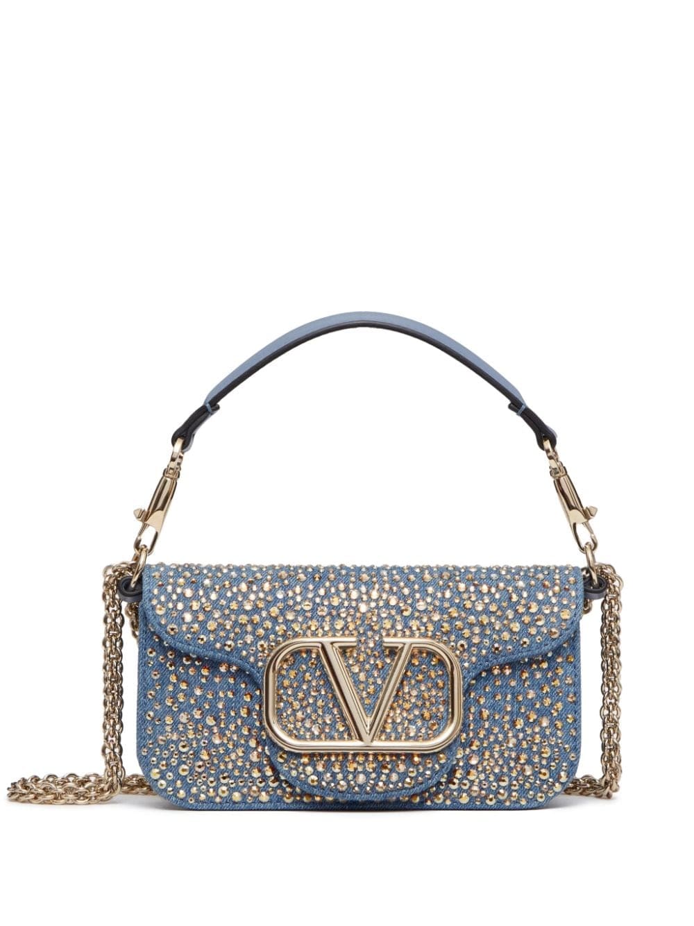 Valentino Garavani's Locò shoulder bag arrives in a smaller iteration and covered in gold-tone stud embellishments for SS24. It's crafted with a blue-hued stretch-cotton denim outer and lambskin lining and features a removable leather top handle and optional sliding chain shoulder strap, which allows for multiple styling options.