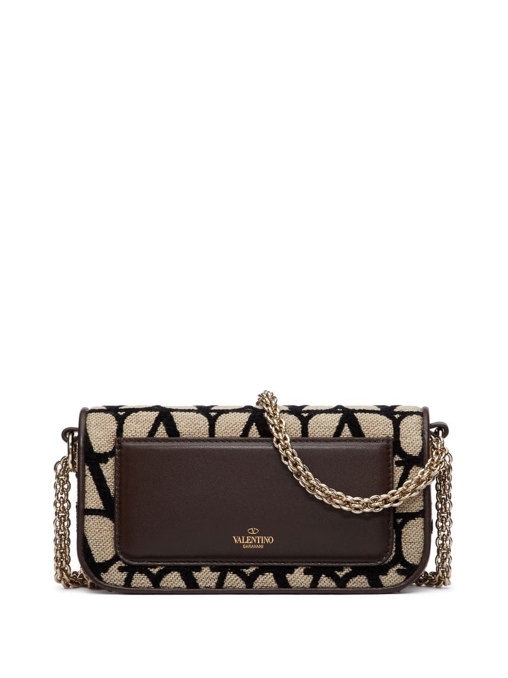 A reinterpretation of the house's VLogo Signature takes centre stage in Valentino's SS23 collection. The Toile Iconographe pattern adorns this shoulder bag, complete with the iconic logo plaque.