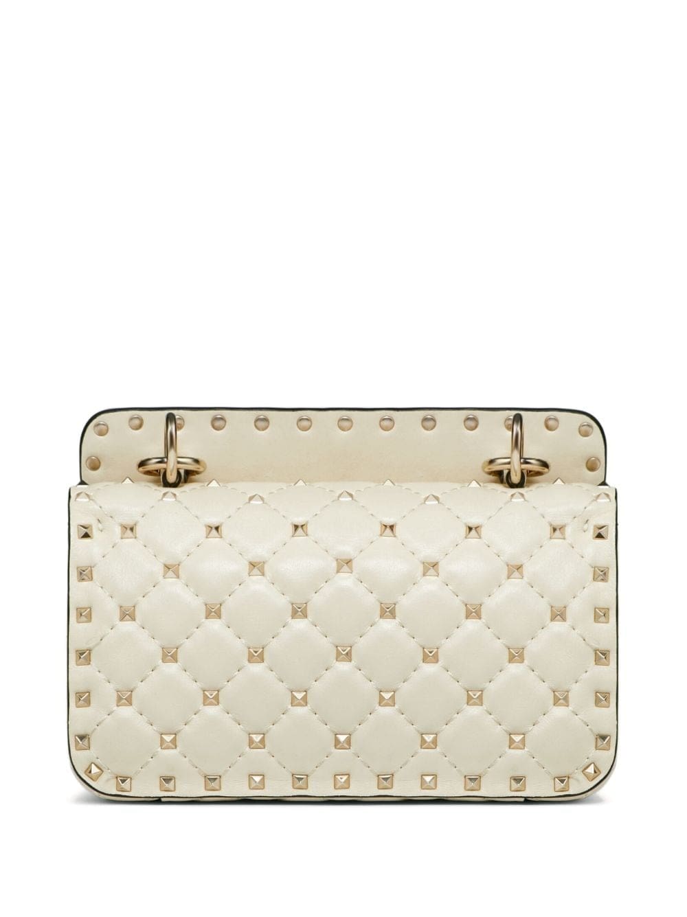 Valentino Garavani's iconic Rockstuds decorate this diamond quilted piece for a high-impact style. Constructed in a white hue, this leather mini bag features a flat top handle and a detachable chain-link shoulder strap that allows its wearer to carry it by hand or over the shoulder.