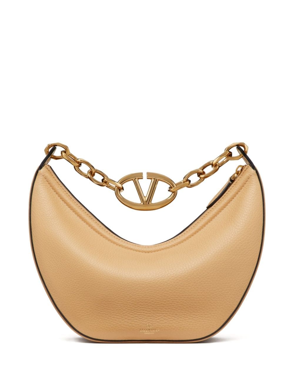 Valentino Garavani's VLogo Moon shoulder bag is named after its crescent-shaped body and signature logo charm at the chain-link top handle. This small iteration is crafted from cappuccino-beige leather to a softly structured silhouette and it benefits from a detachable, adjustable strap that allows it to be worn in multiple ways.