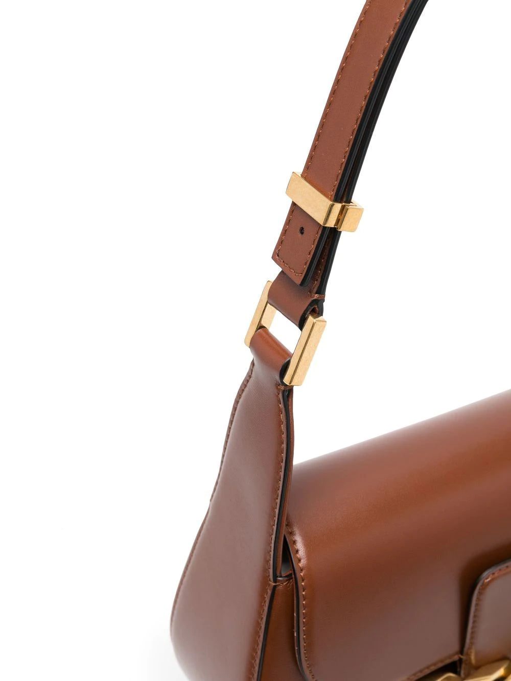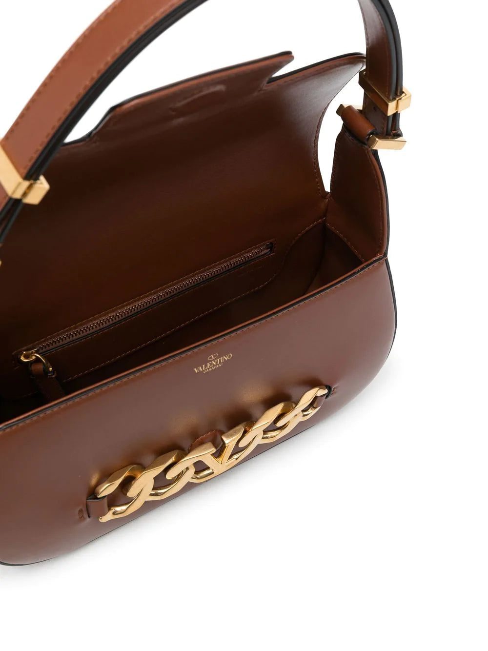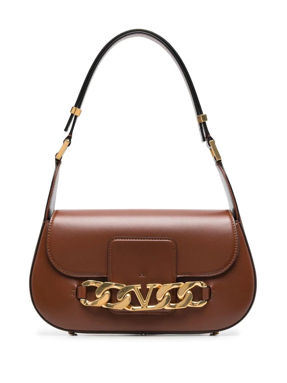 Decorated with a gold-tone chain-link VLogo to its front, this sleek bag by Valentino Garavani is crafted in a smooth leather construction. Showcasing a curved silhouette, the elegant design is suspended from an adjustable single top handle.