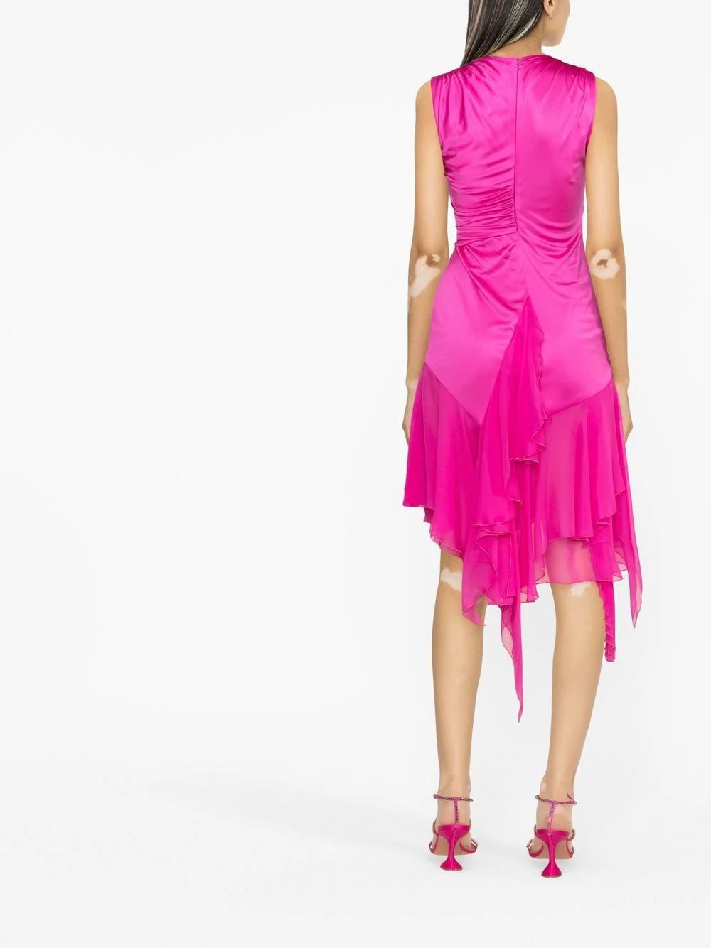 Versace moves away from emblematic house codes to present this panelled fuchsia-pink dress. It's characterised by gathered detailing and an asymmetric handkerchief hem that grazes the knee.