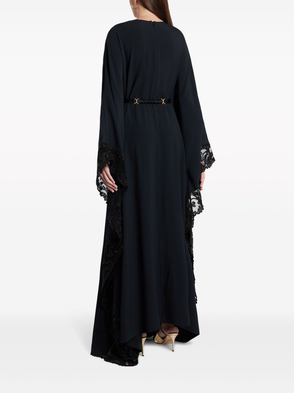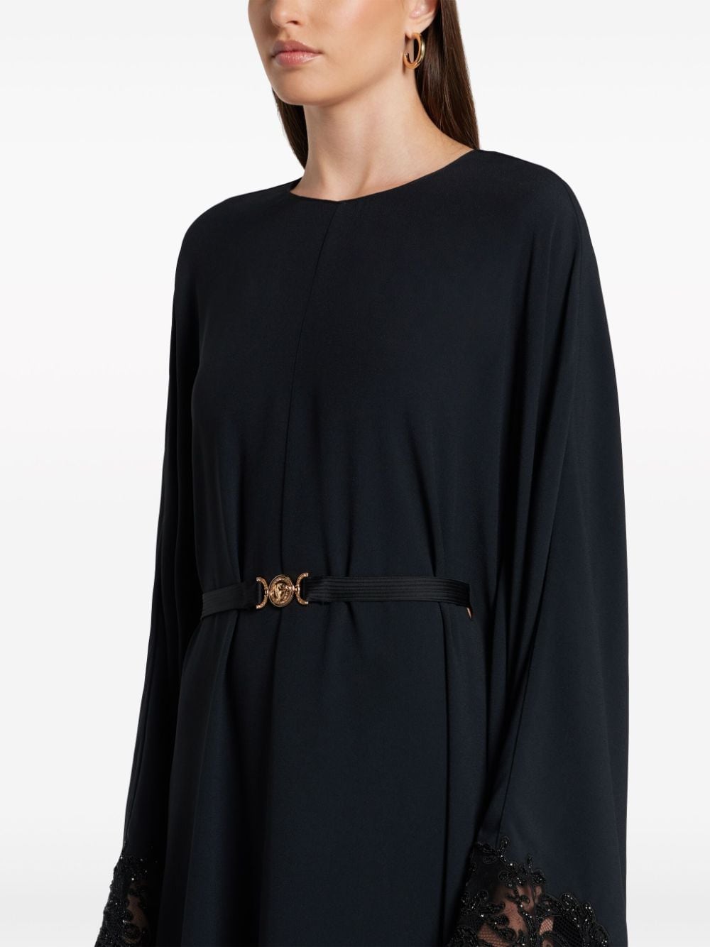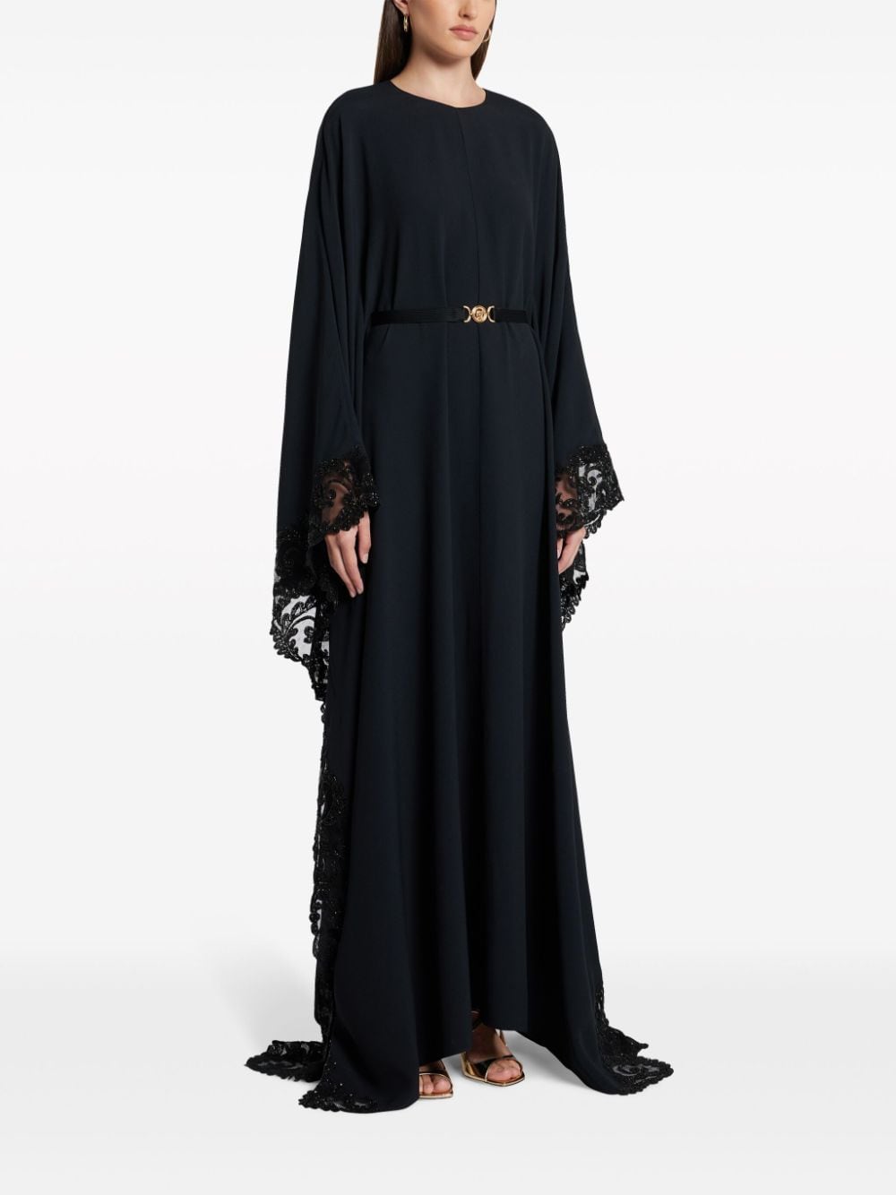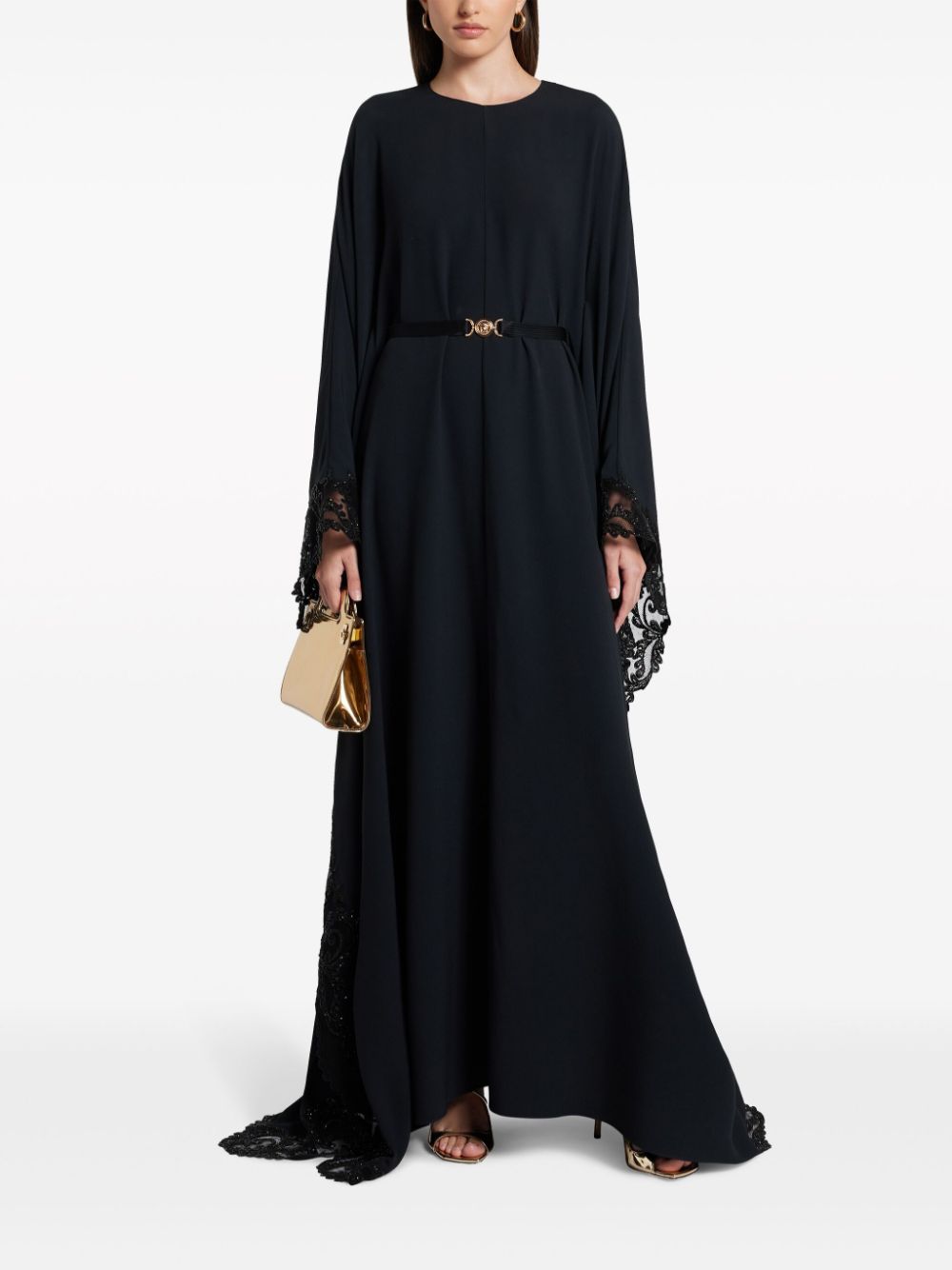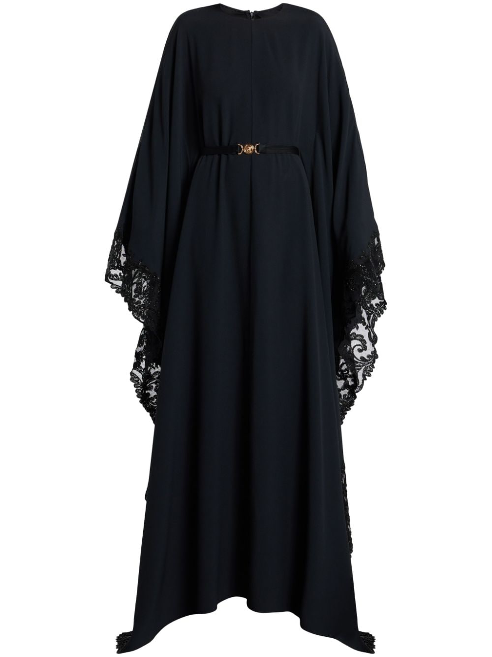 This black gown is delicately adorned with Barocco-shaped lace trimming on the sleeves, showcasing Versace's penchant for intricate embellishments. Medusa '95 hardware decorates the matching belt for a contrasting branded touch.