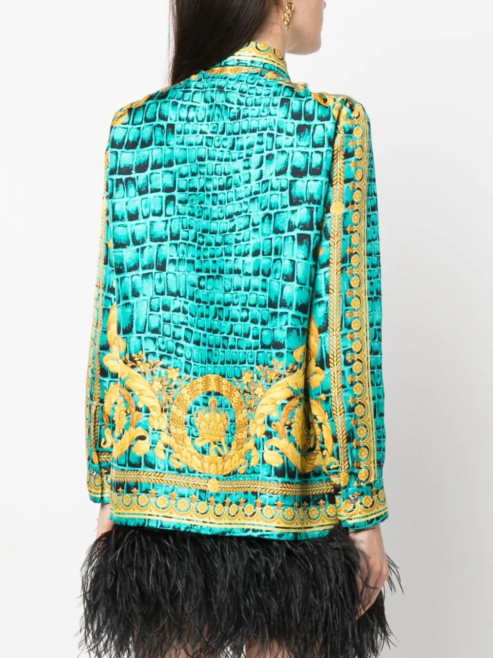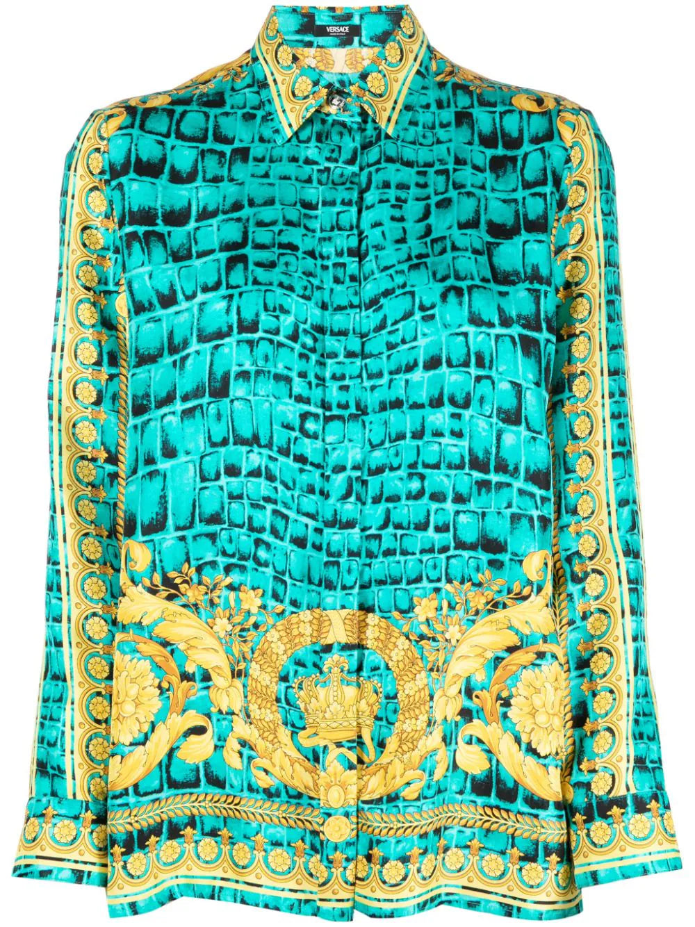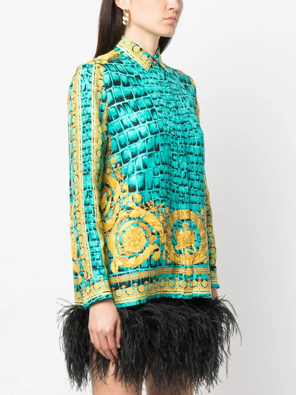This Versace shirt showcases the brand's iconic Barocco print in a striking blue and yellow palette. Crafted from sumptuous silk, the design features a classic collar and concealed front button fastening, while the long sleeves with buttoned cuffs ensure a polished finish.