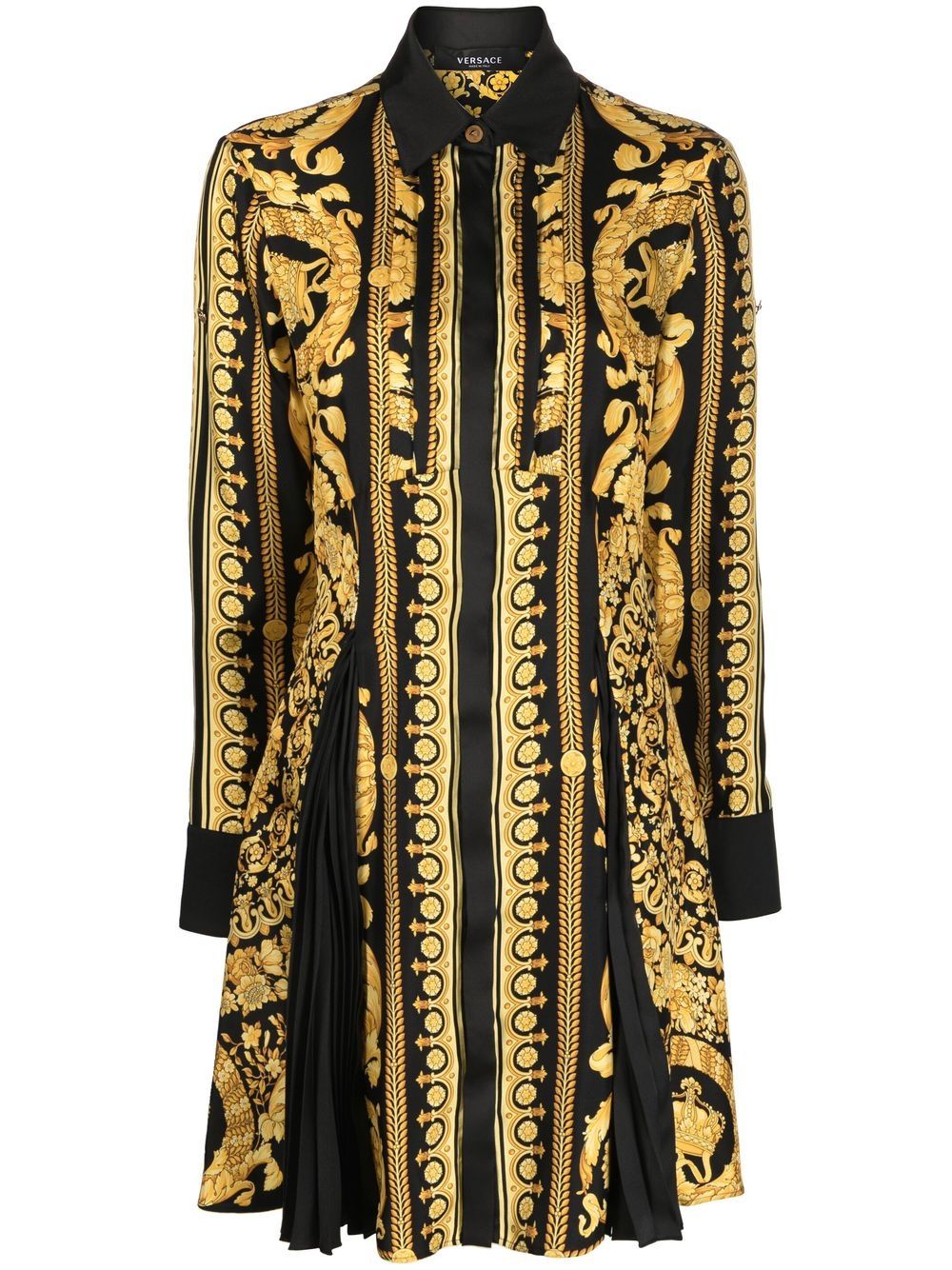 Versace found inspiration in architectural baroque elements to create the iconic Barocco print, one of the Italian fashion house's signature motifs. Arriving in its classic black and gold colourway, the pattern decorates this pleated shirt dress for instant recognition.