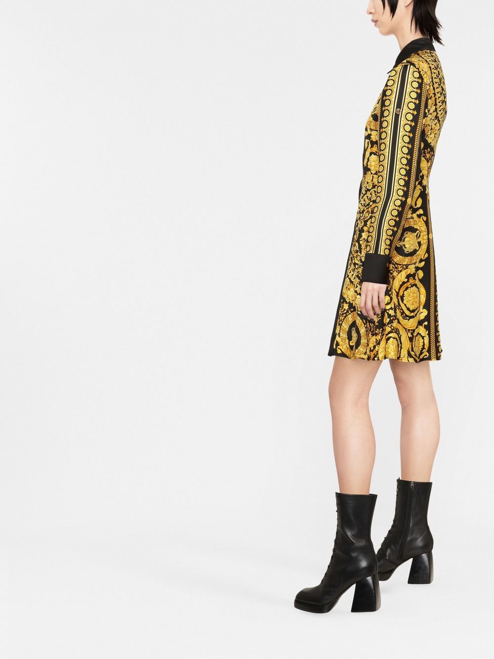Barocco-print pleated dress from VERSACE featuring black, gold-tone, silk, signature Barocco print, classic collar, concealed front fastening, long sleeves, buttoned cuffs, pleated skirt and knee-length.