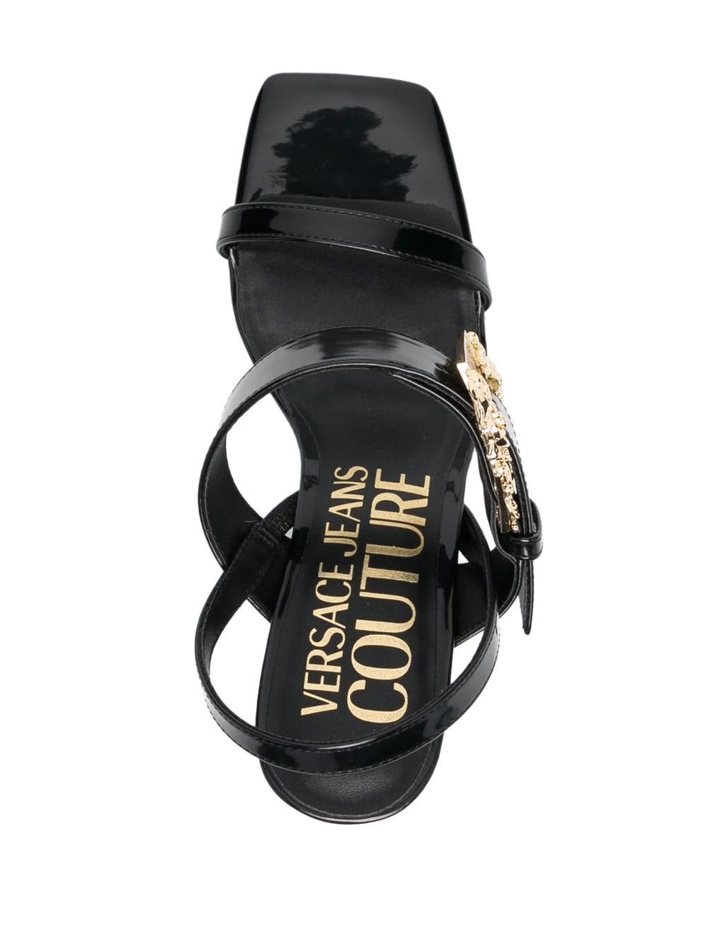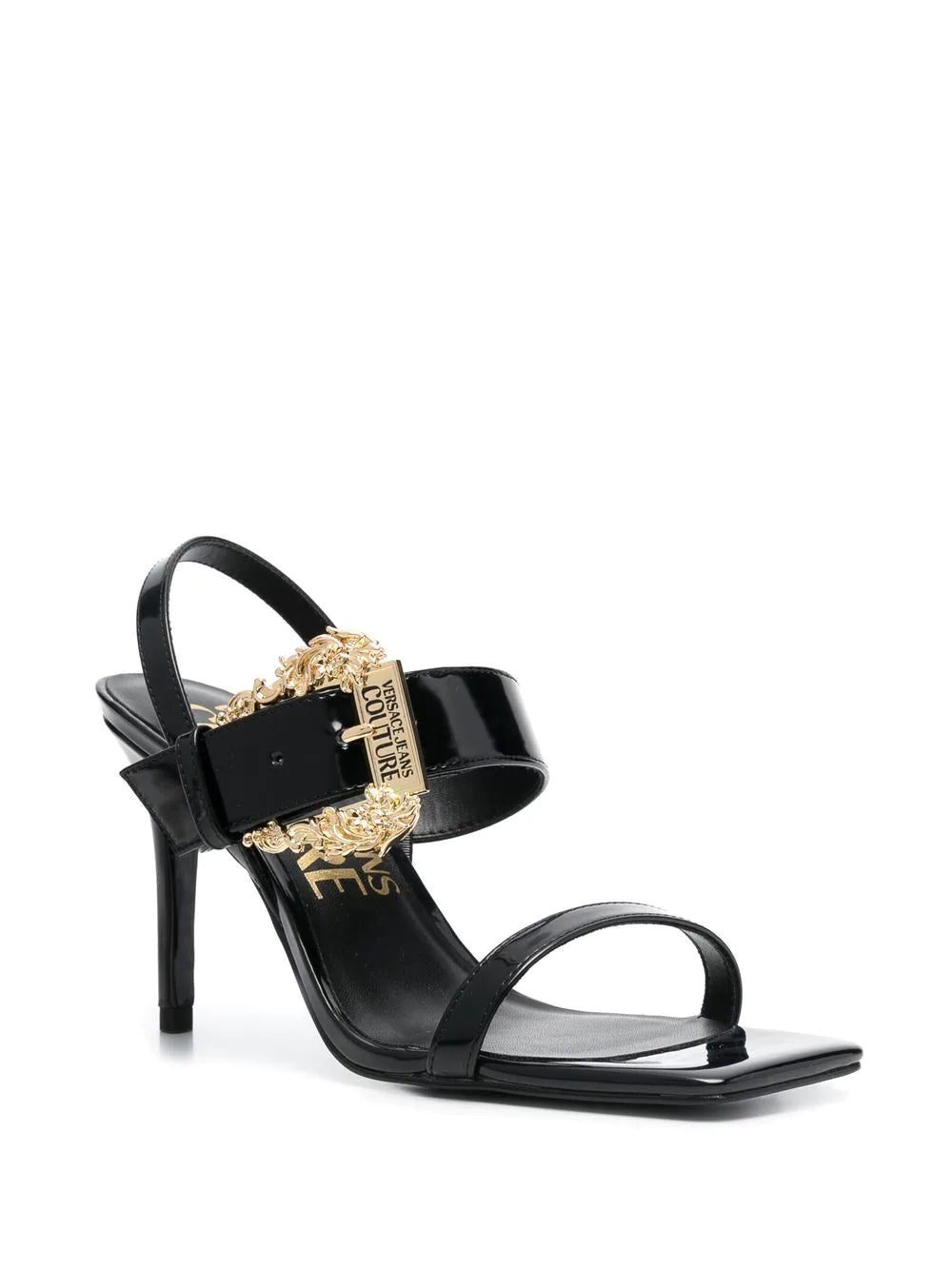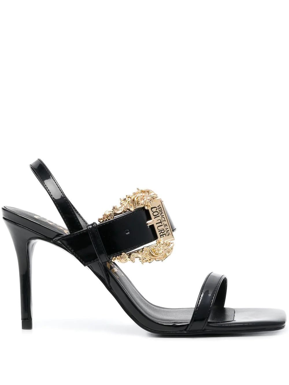 buckle-fastening heeled sandals from VERSACE JEANS COUTURE featuring black, square toe, open toe, branded insole, high heel, buckle-fastening ankle strap and gold-tone buckle fastening.