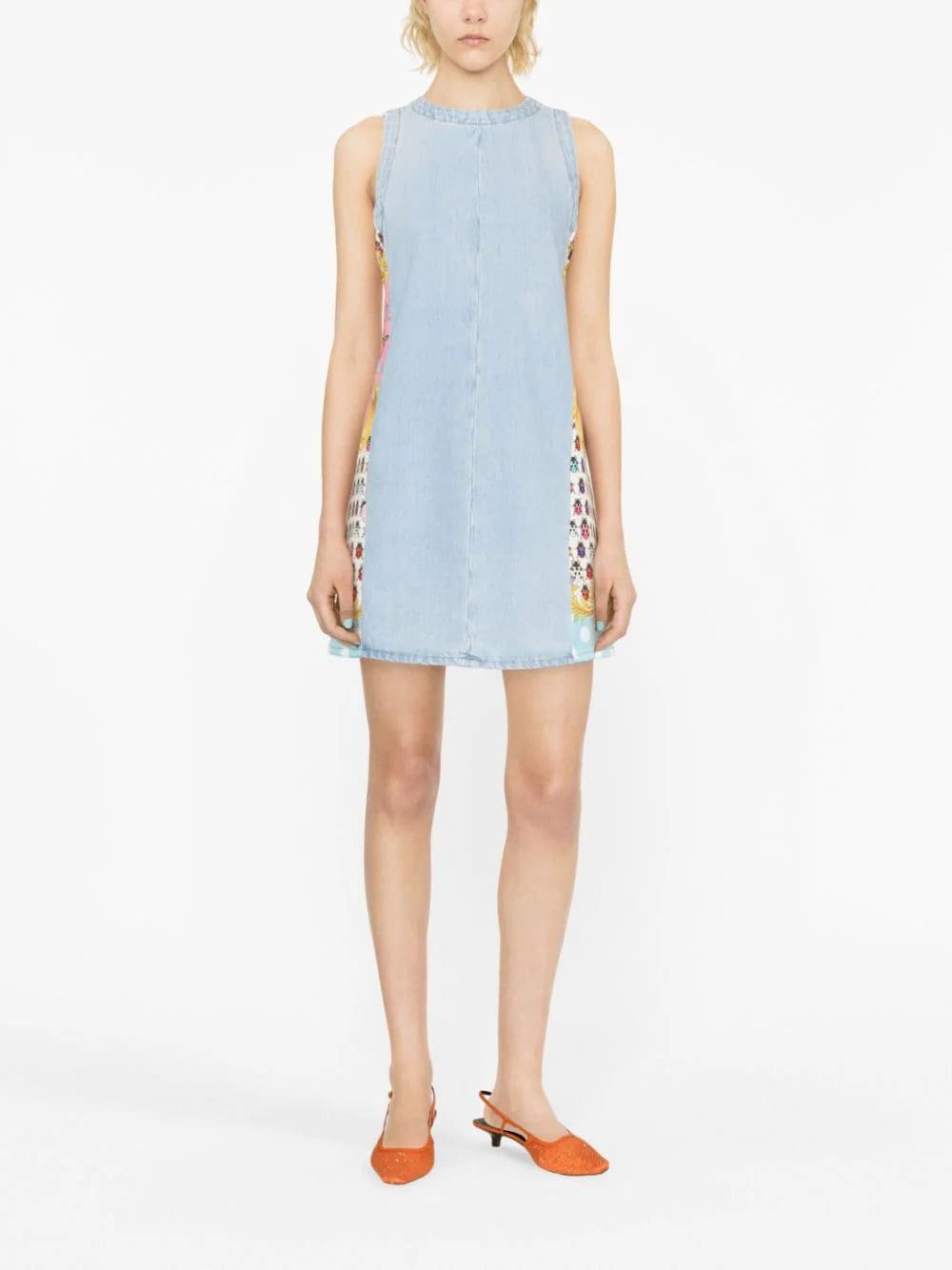 Detailed with the iconic Butterflies and Ladybugs print inserts at the sides, this Versace minidress speaks to the brand's glamorous aesthetic. Crafted in light blue stonewashed denim, it falls smoothly to the thighs.