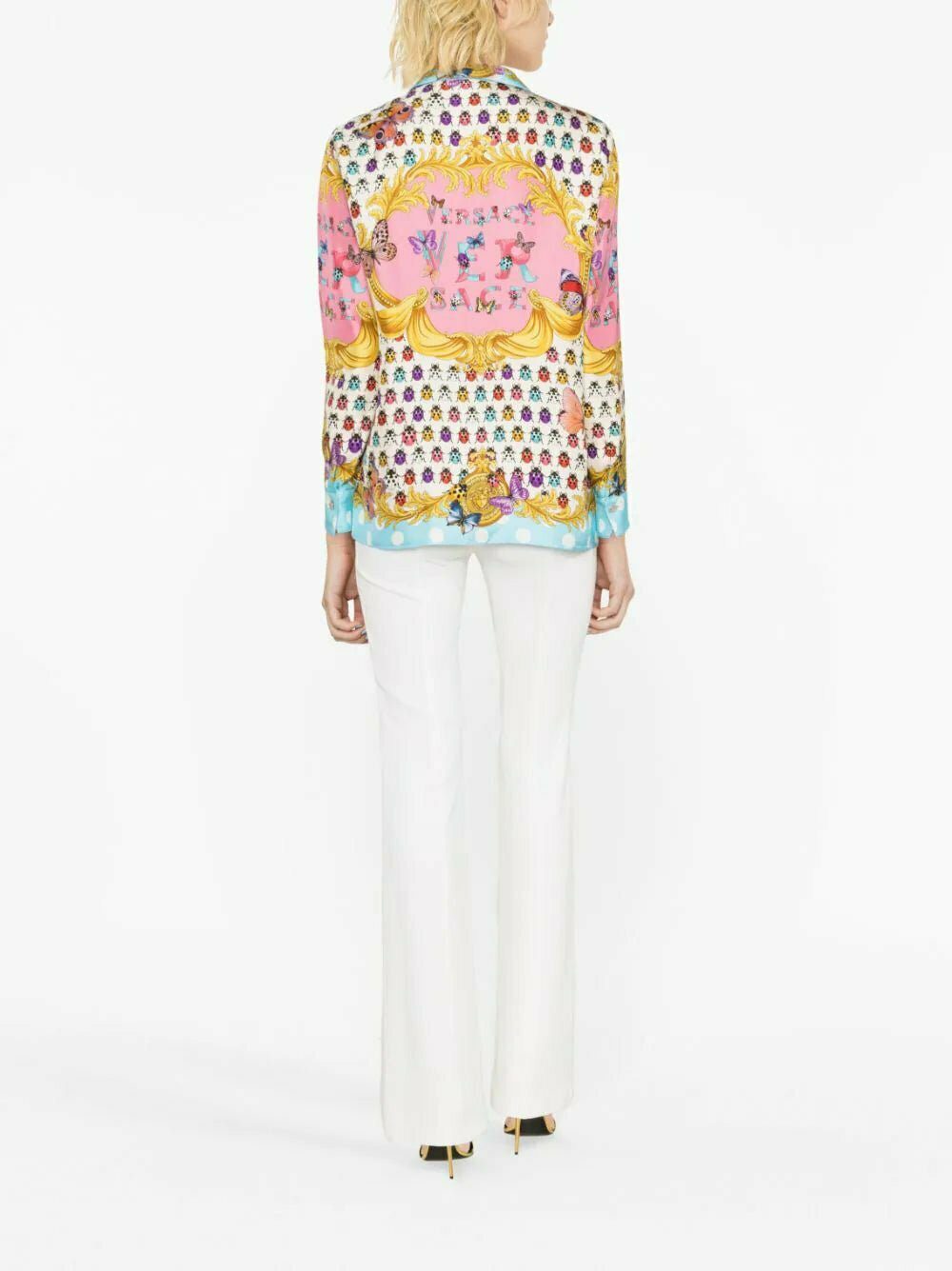 Versace channels its affinity for high-octane glamour in this sumptuous silk shirt. It's cut for a loose, languid silhouette and decorated with a bold Heritage Butterflies and Ladybugs print — a revived archival motif set against a polka dot background with Baroque flourishes.