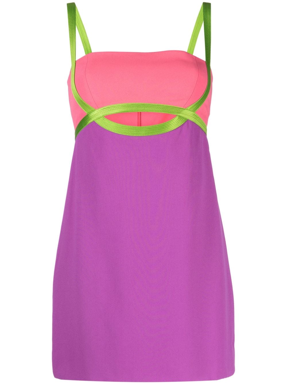 This mini dress shows Versace's bold style. Made from a silk blend, it features an eye-catching design in purple and pink, while a green trim detail finishes the look.