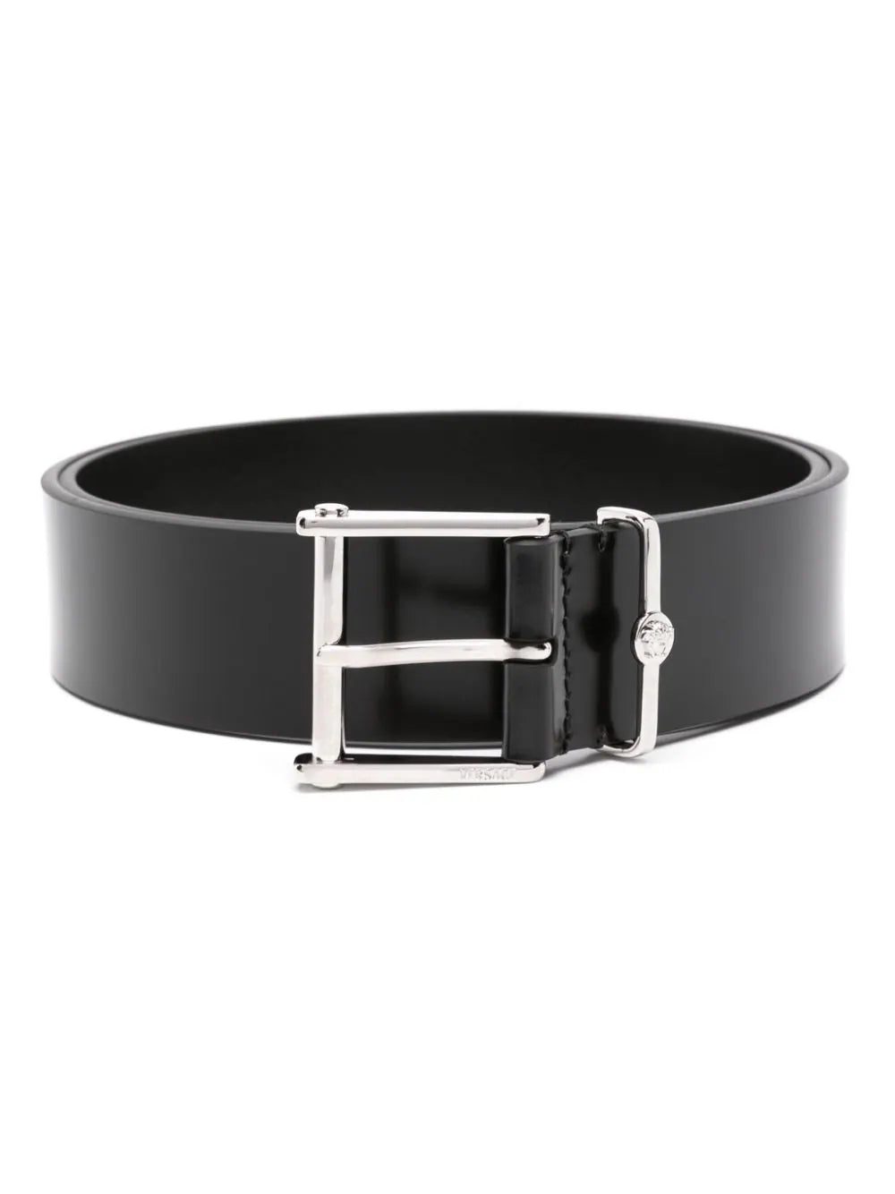 Showcasing its preference for Greco-Roman motifs, Versace accents the smooth leather construction of this black belt with a silvery buckle inspired by classical columns and a belt loop punctuated by a minute Medusa Head motif.