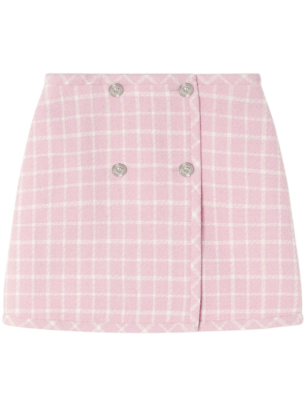 Spun in Italy from a blend of virgin wool, this light pink miniskirt from Versace is emblazoned with a contrasting check pattern throughout for a timeless appeal. It sits high at the waist and buttons at the front in a double-breasted style.