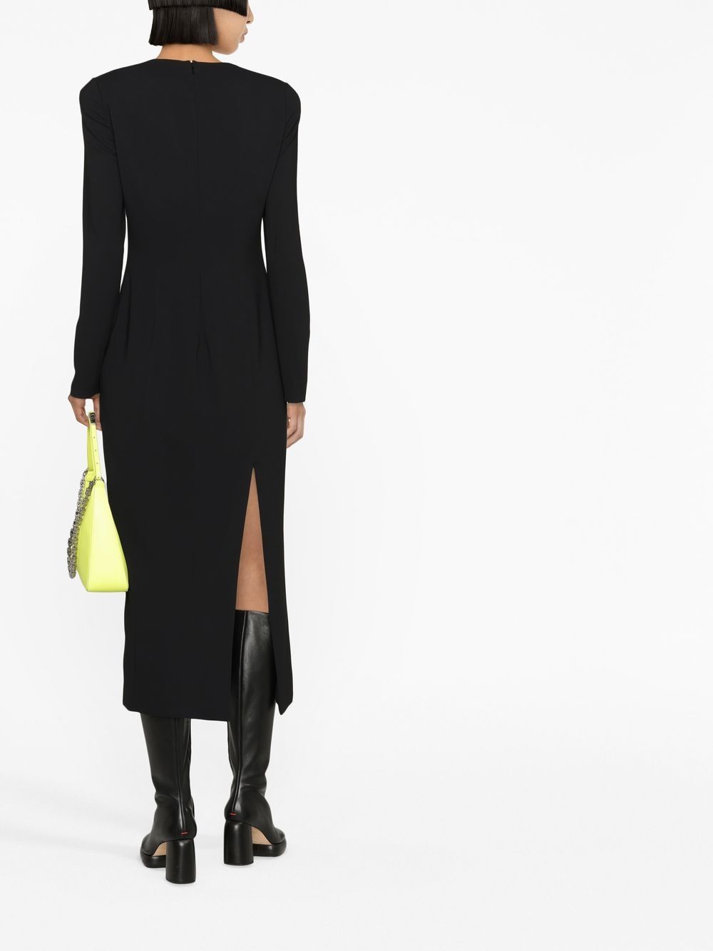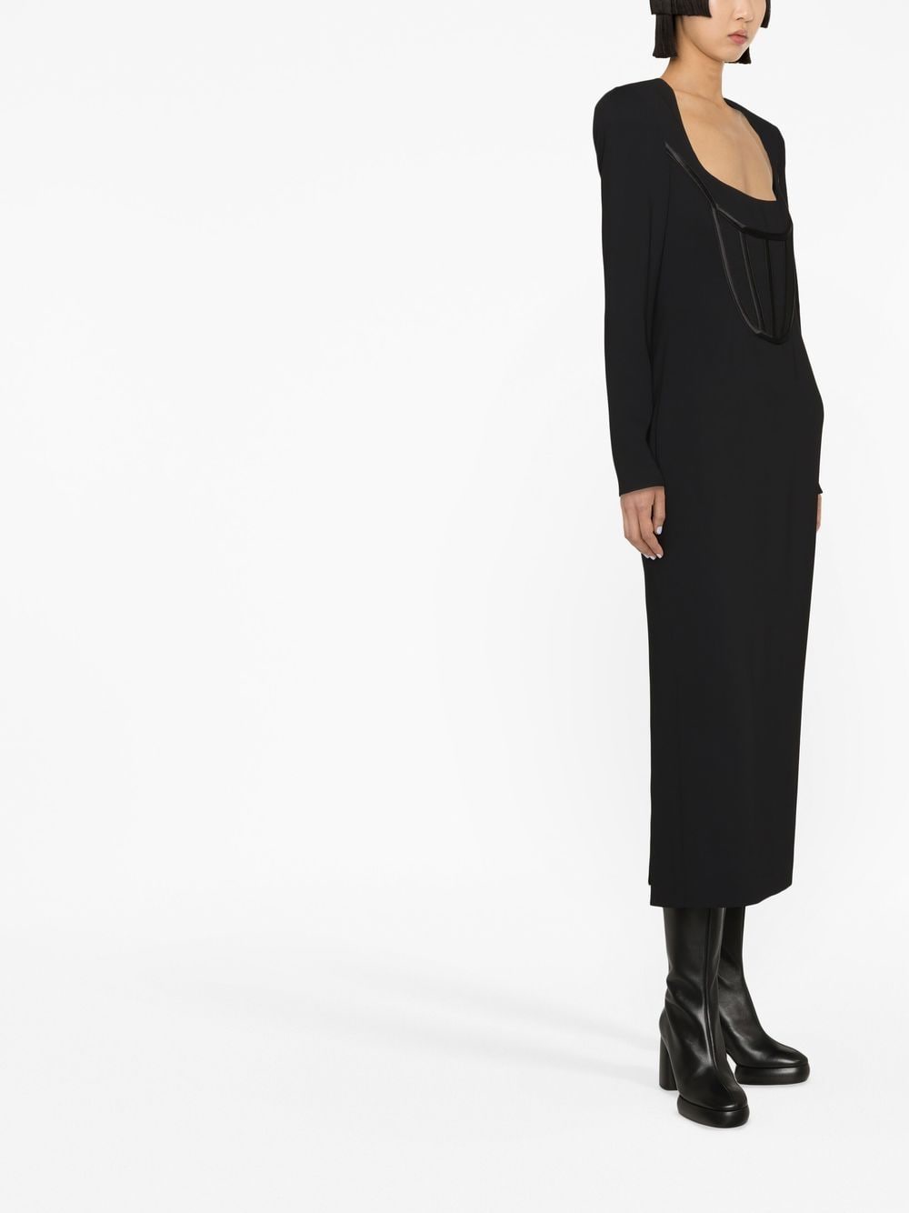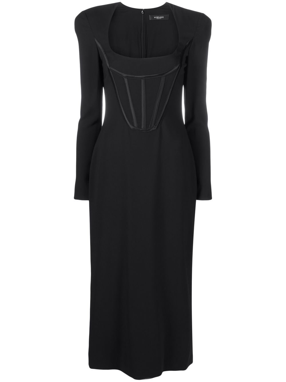 Crafted from crêpe georgette, this long-sleeved design is a recognisable style from the Italian brand. It features a reworking of the signature Atelier Versace corset incorporated into the midi dress silhouette.