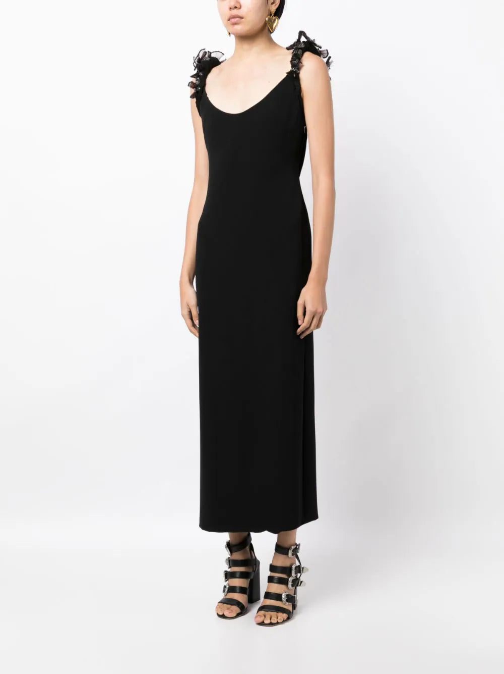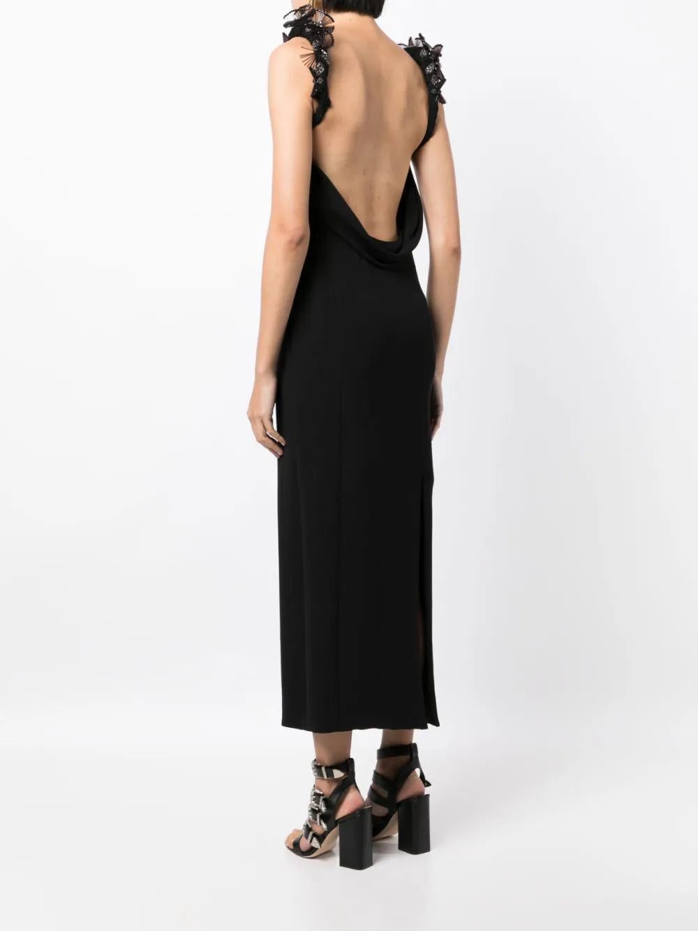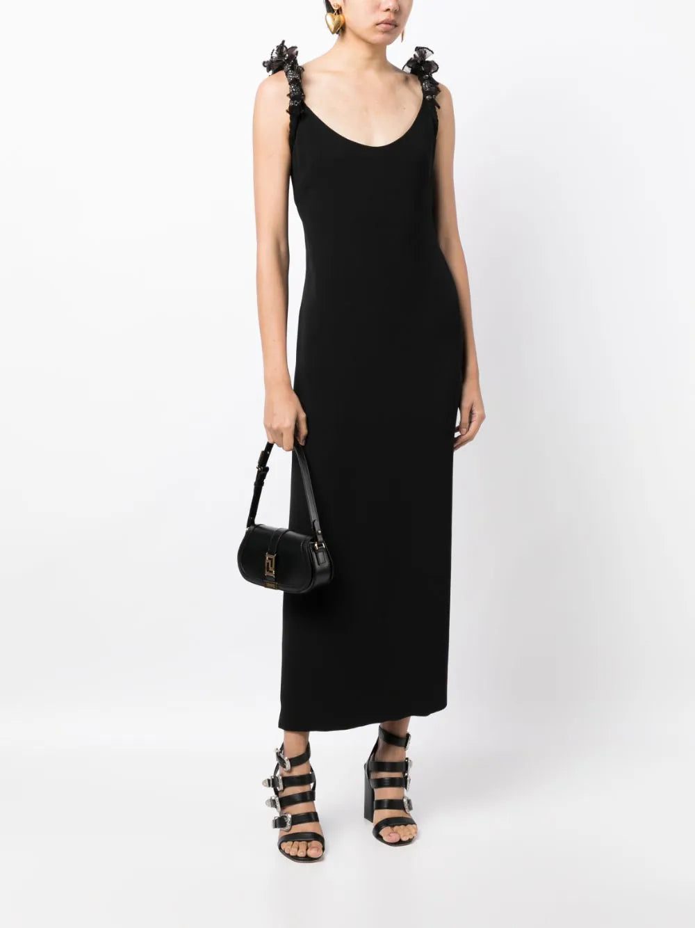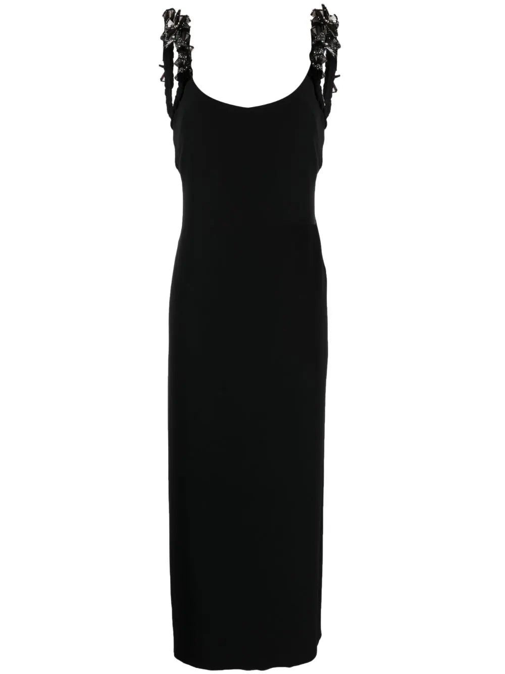 Capturing Versace's timeless style, this black dress is crafted with silk cady and boasts crystal-embellished shoulder straps for a shimmering finish. The slim silhouette reinforces the brand's sophistication, while a generous back opening brings a bold spin to the design.