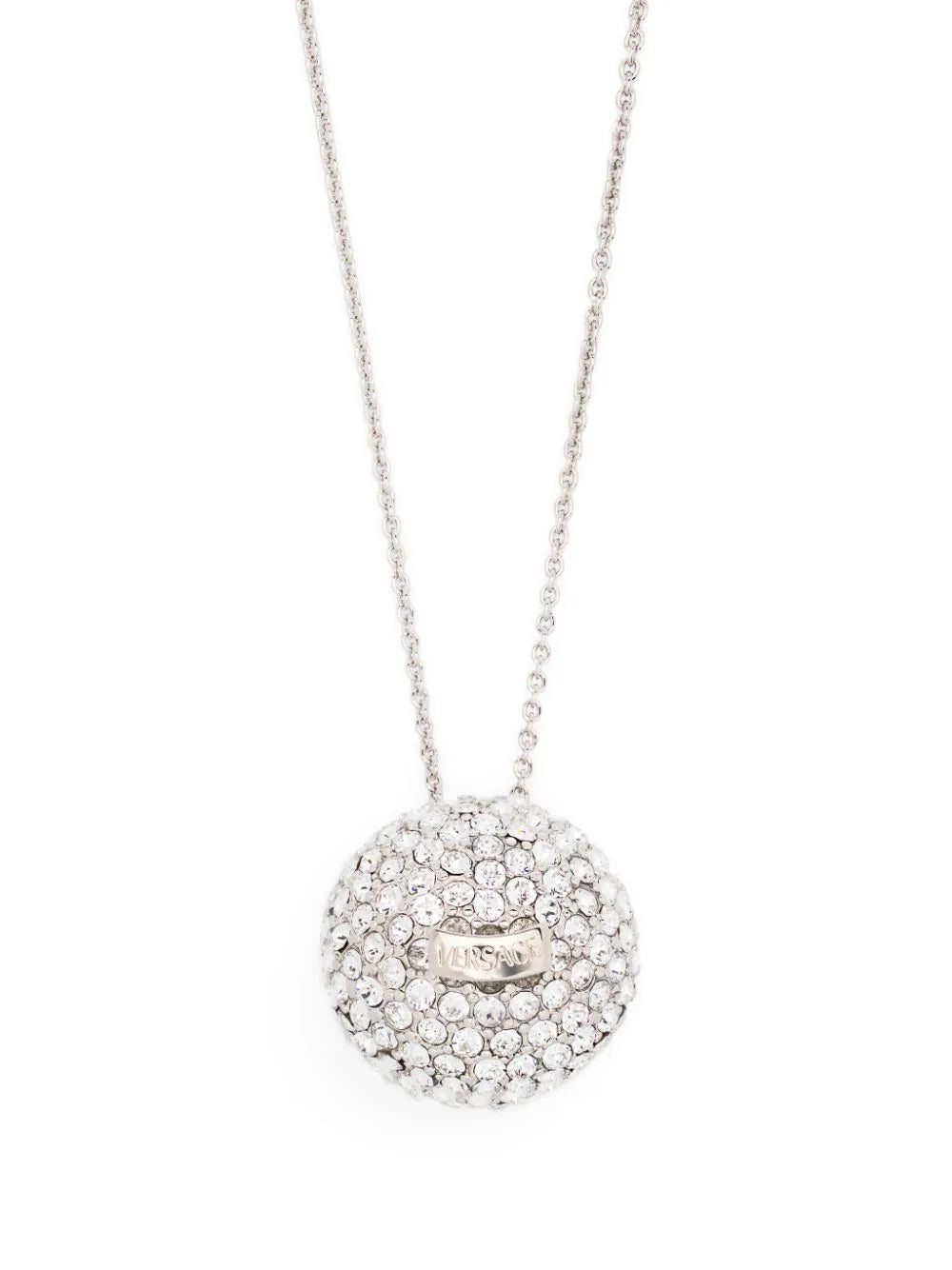 Versace’s bold elegance is seen throughout this necklace; a long chain-link neck strap holds a crystal sphere with a logo-engraved plaque.