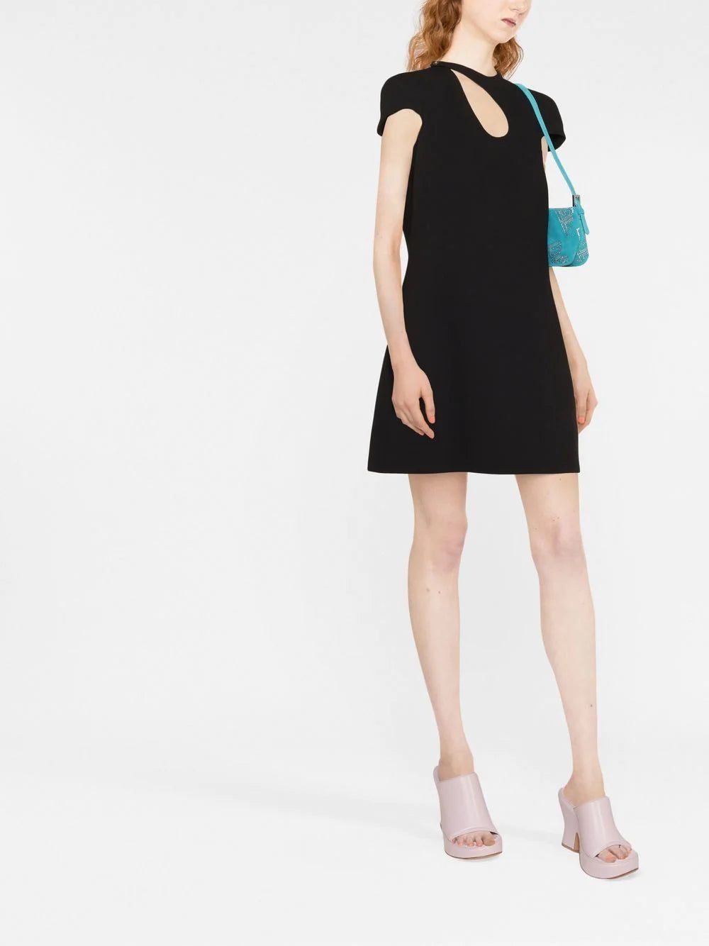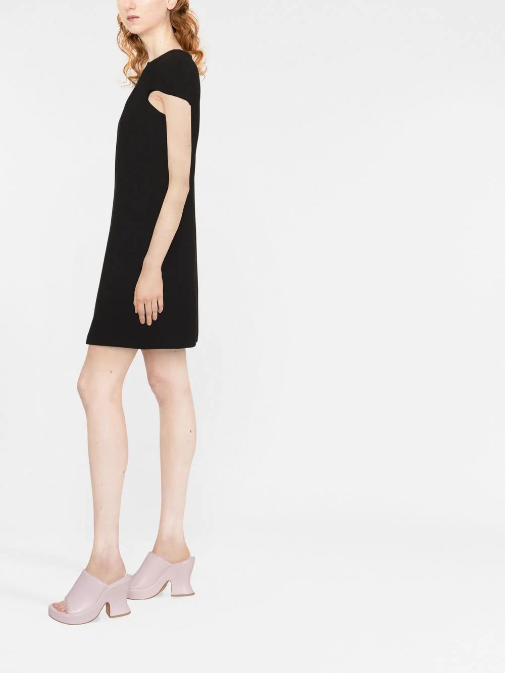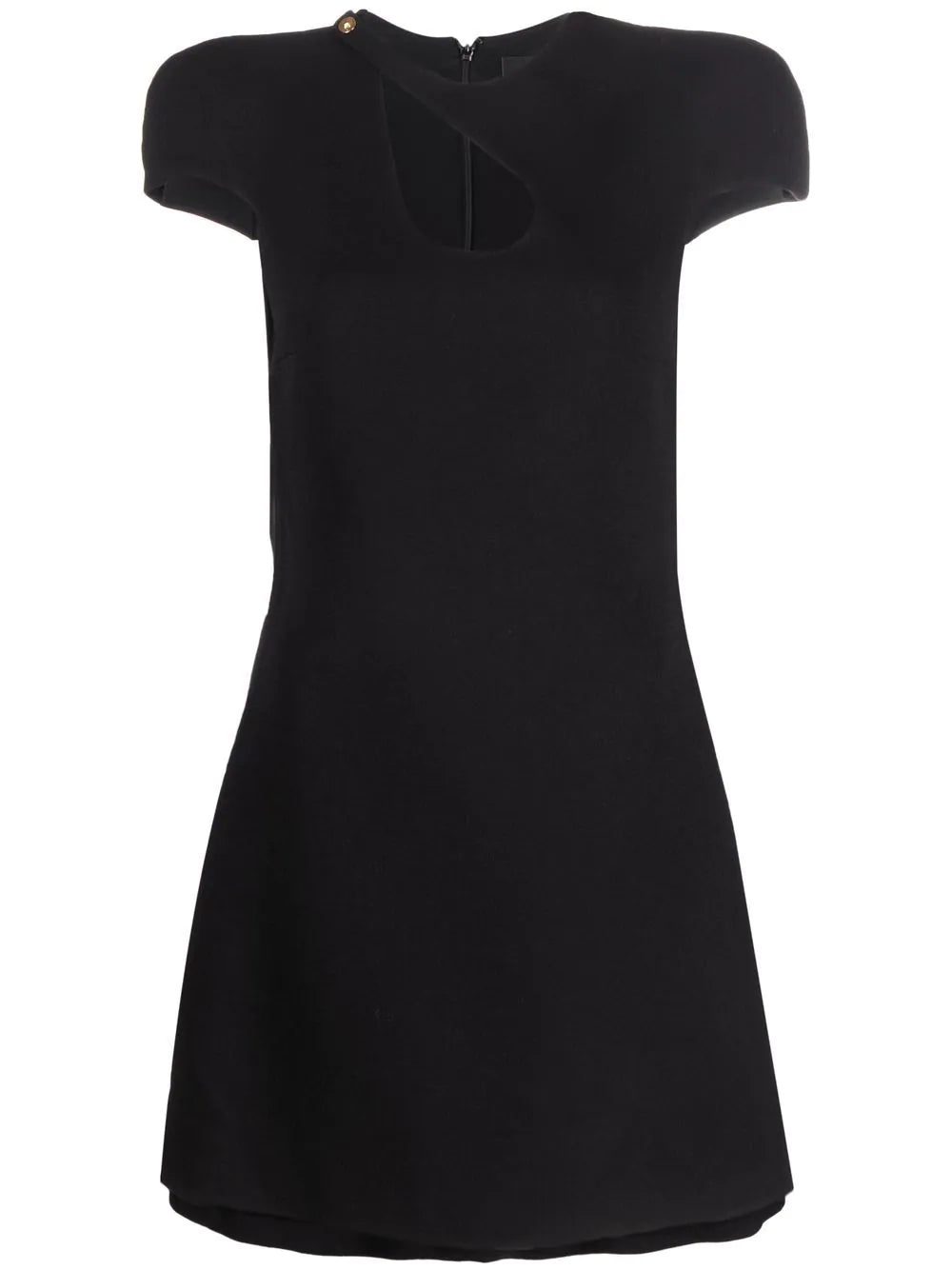 cut-out detail mini dress from VERSACE featuring virgin wool blend, logo-debossed buttons, cut-out detailing, round neck, short sleeves, flared, above-knee length, straight hem and black.