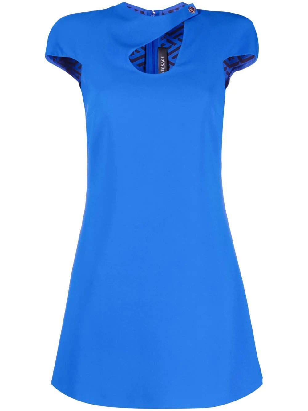 Versace's minidress offers a fresh take on humble shift styles. This bright blue iteration is punctuated with a teardrop-shaped cut-out at the chest revealing a glimpse of skin.