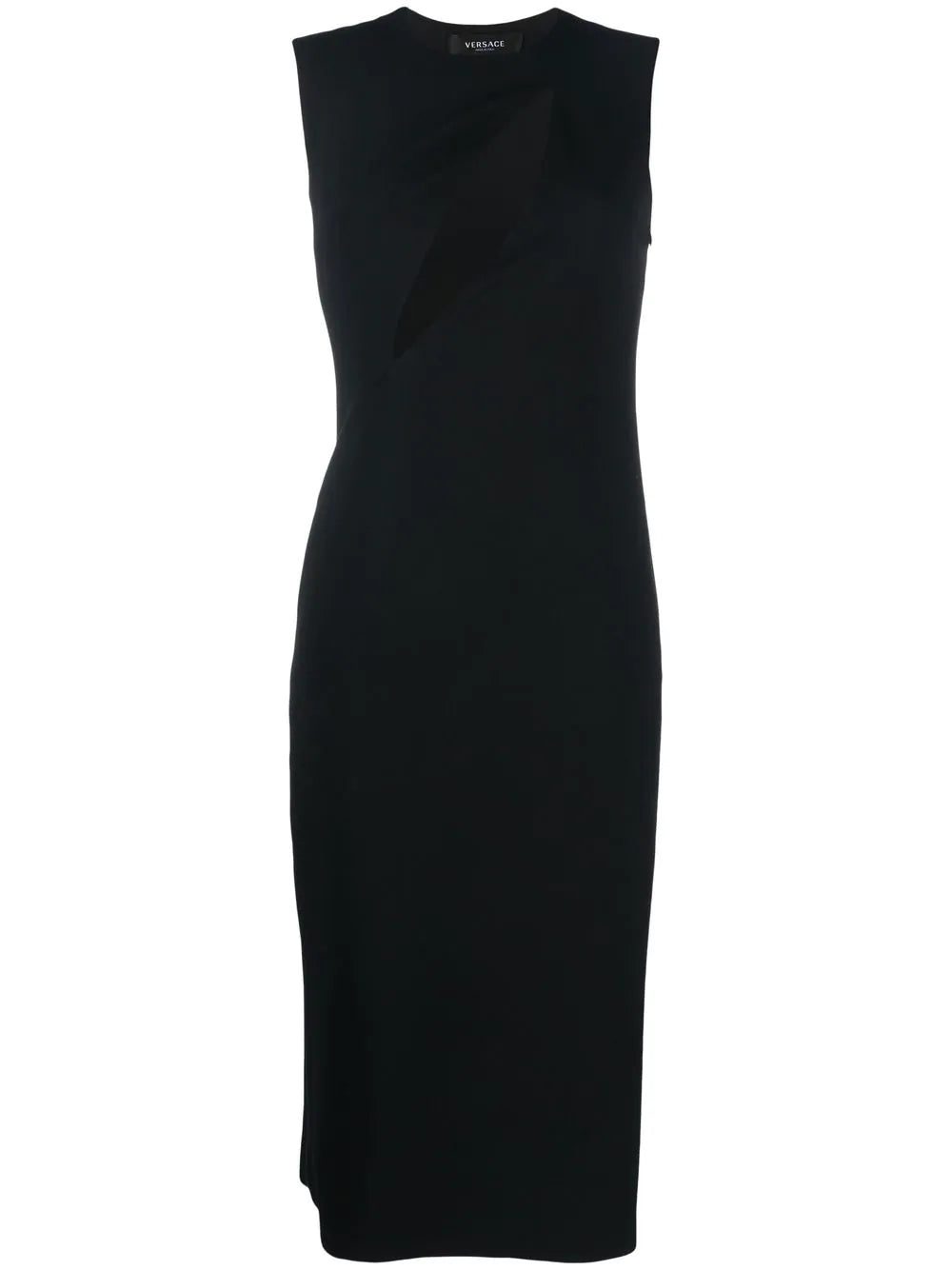 This midi dress is peppered with details that speak to Versace's daring aesthetic. The all-black design is detailed with cut-outs at the front and back, while a side rear slit further enhances its extravagant feel.