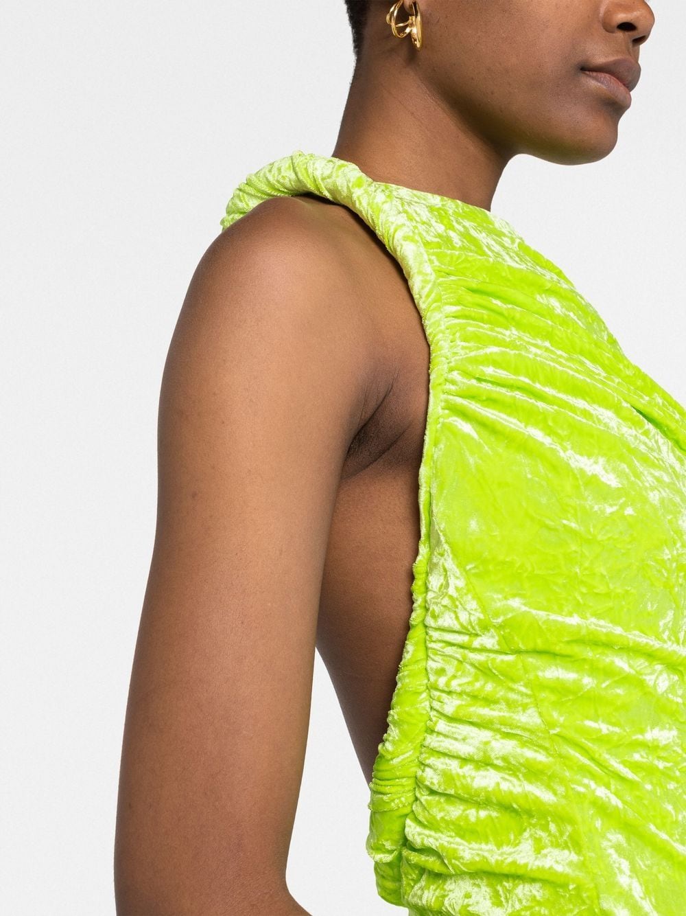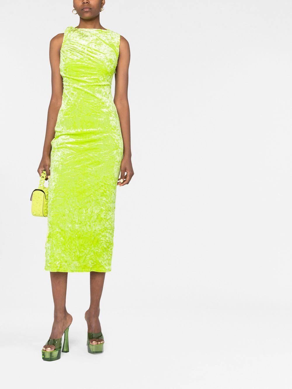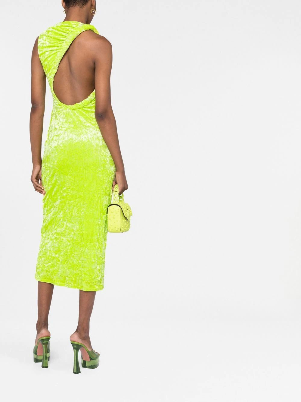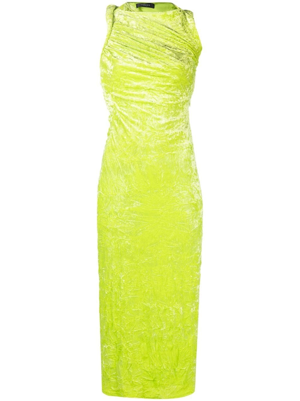 Reflective of Versace's vivacious spirit, this midi dress boasts a crushed velvet construction in an acid green hue. The asymmetric silhouette is punctuated with a rolled one-shoulder and open back detailing.