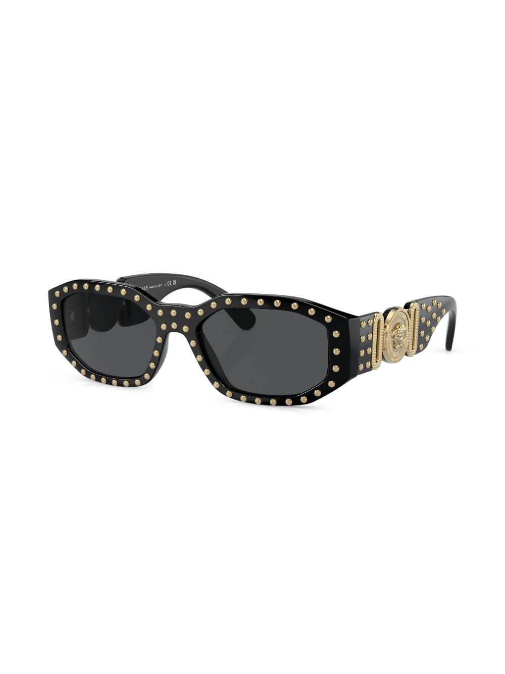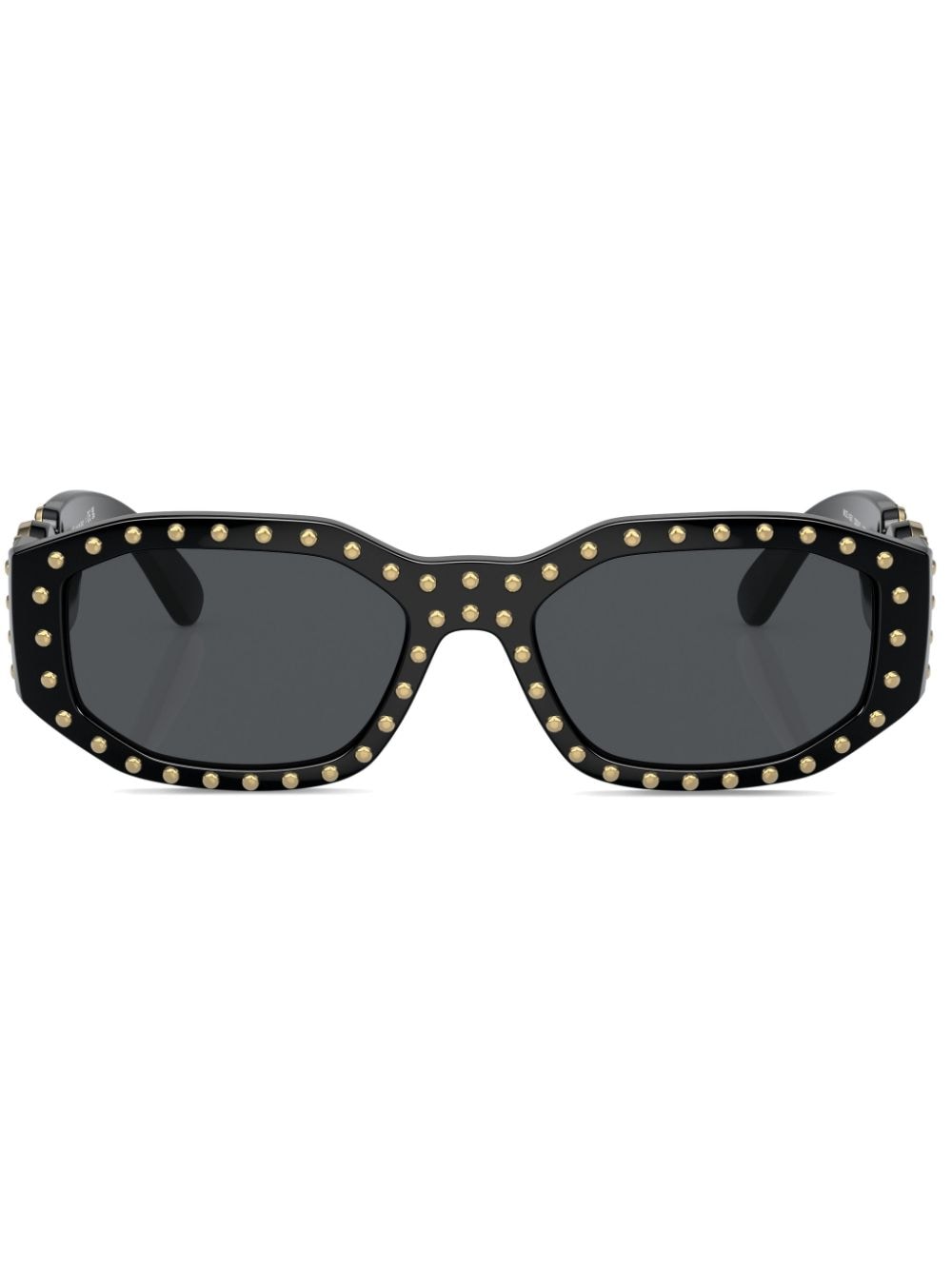 black acetate grey tinted lenses geometric frame gold-tone stud embellishment Medusa Head motif gold-tone logo plaque oversize arms curved tips These glasses come with a protective case.