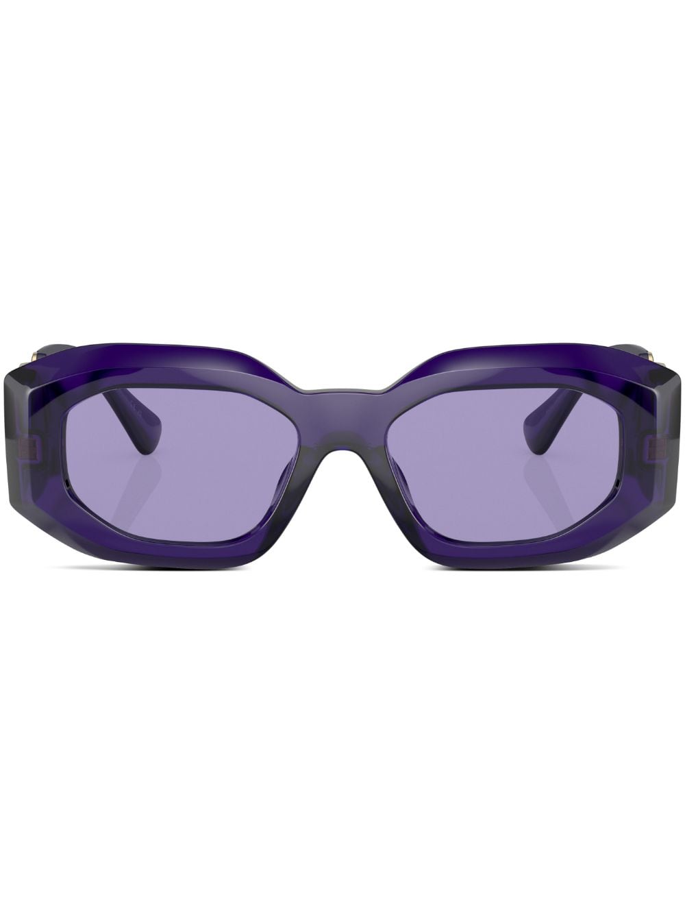 indigo purple acetate transparent design purple tinted lenses geometric frame Medusa Head motif gold-tone logo plaque oversize arms curved tips These glasses come with a protective case.
