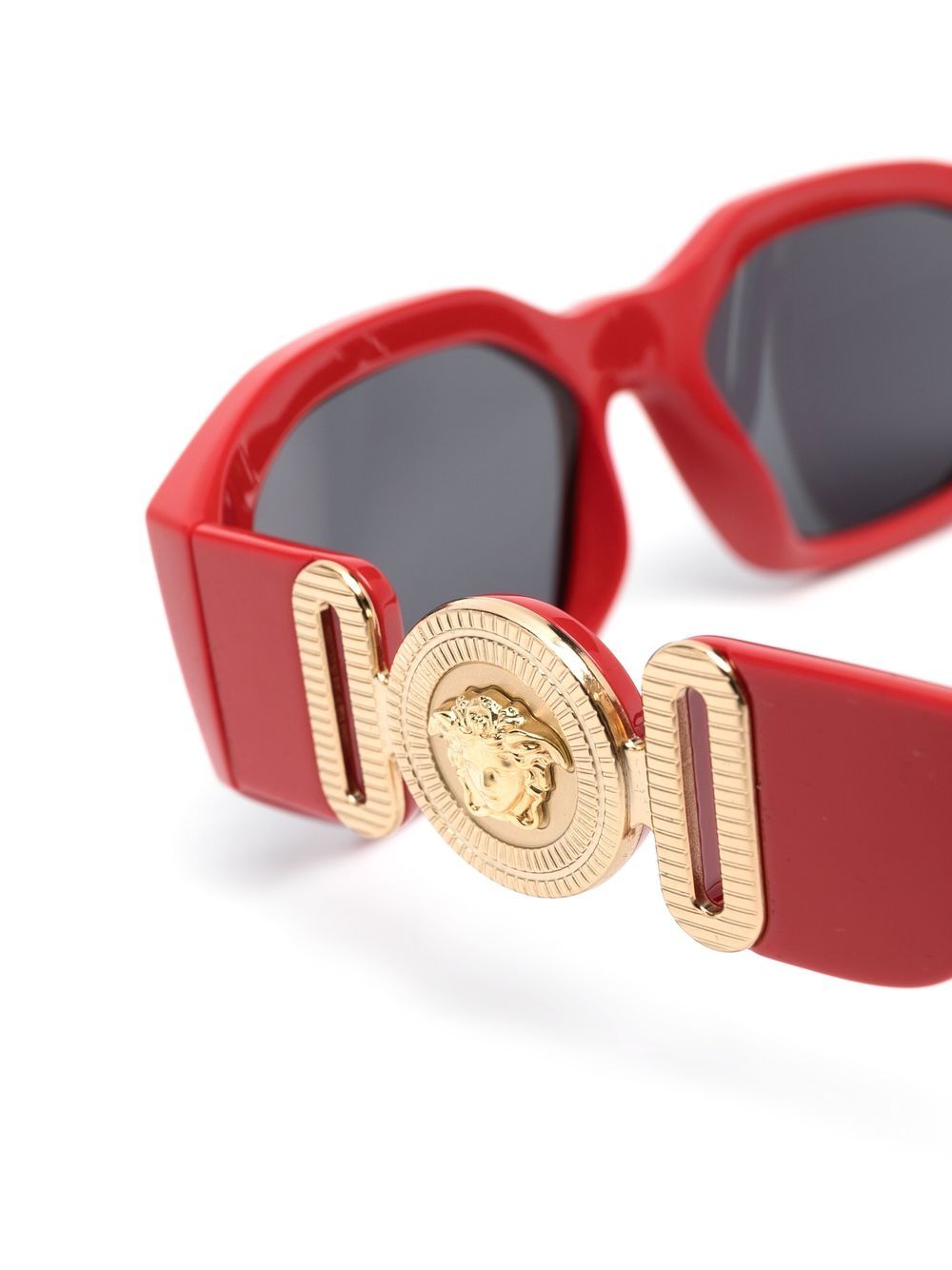 red Medusa plaque detail oval frame tinted lenses oversize arms curved tips These glasses come with a protective case.