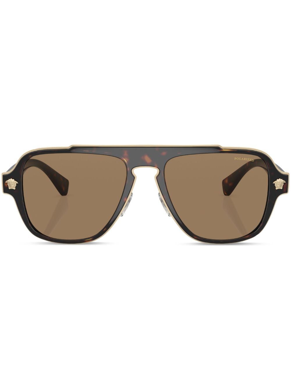 cedar brown metal/acetate tortoiseshell effect Medusa plaque detail brown tinted lenses pilot frame straight arms curved tips These glasses come with a protective case.