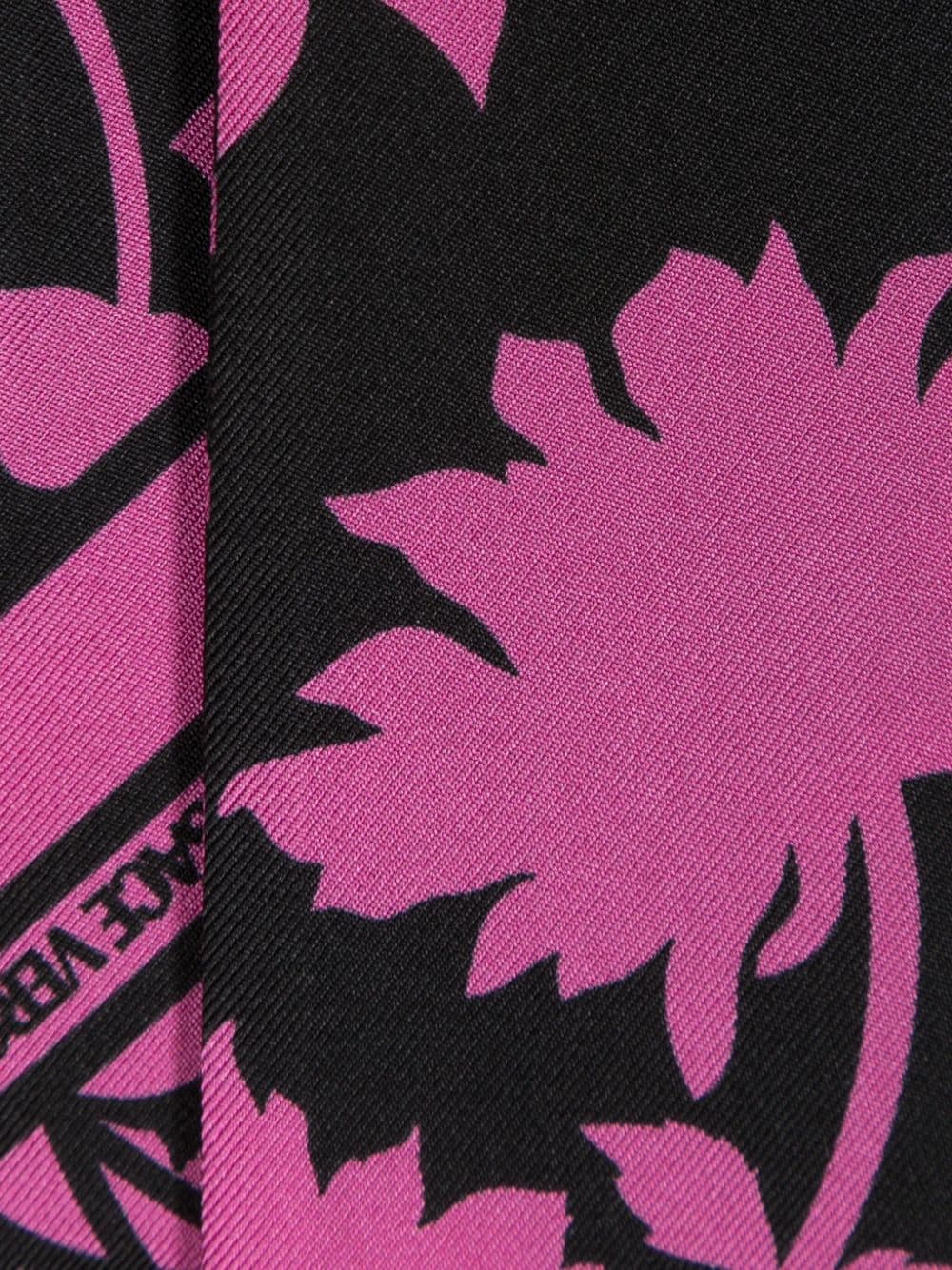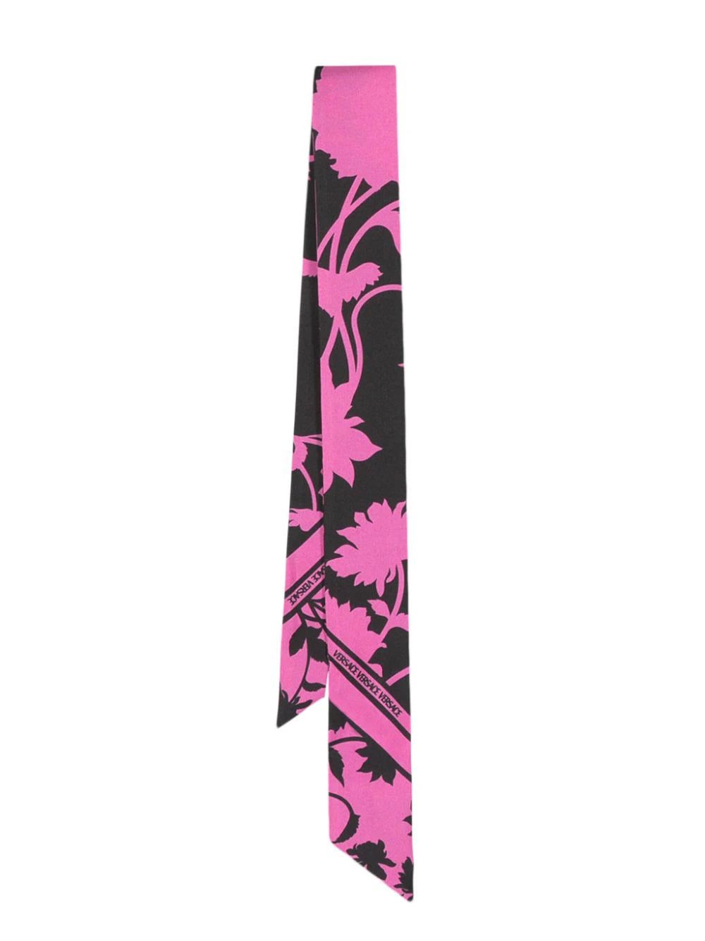 Enlivened with Versace's floral print, this scarf tie is crafted from pure silk. The black and pink colourways create a soft contrast, while petite logo prints punctuate the design.