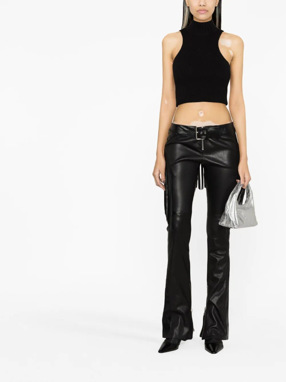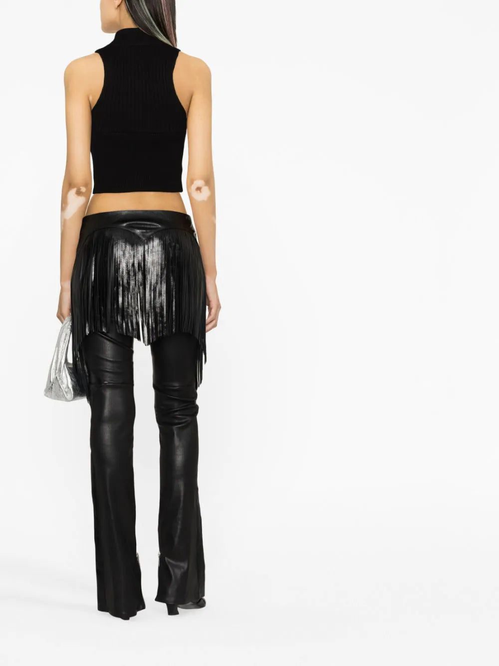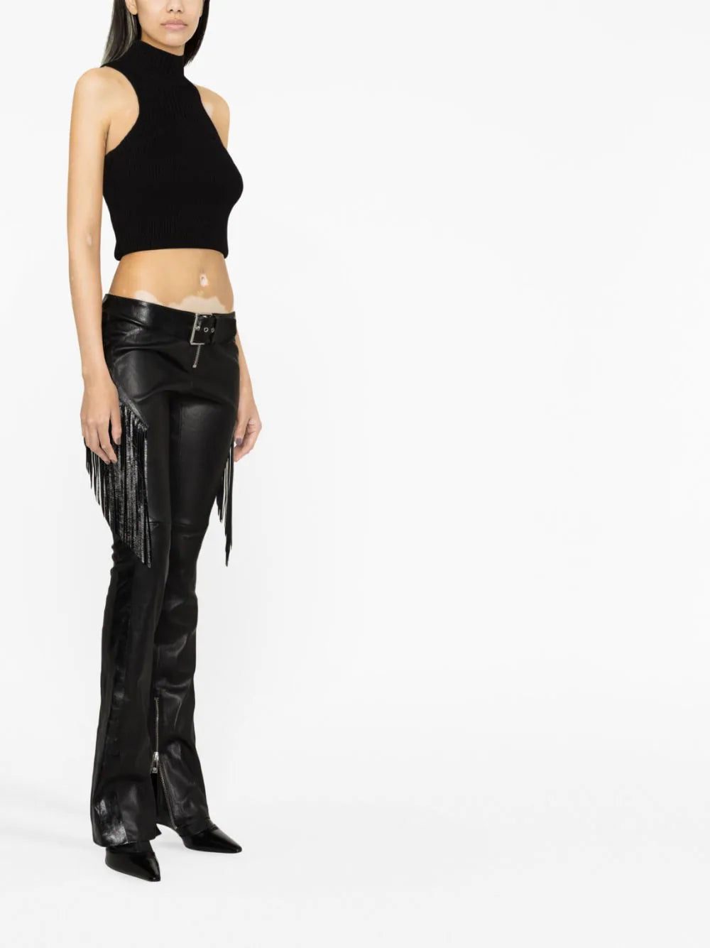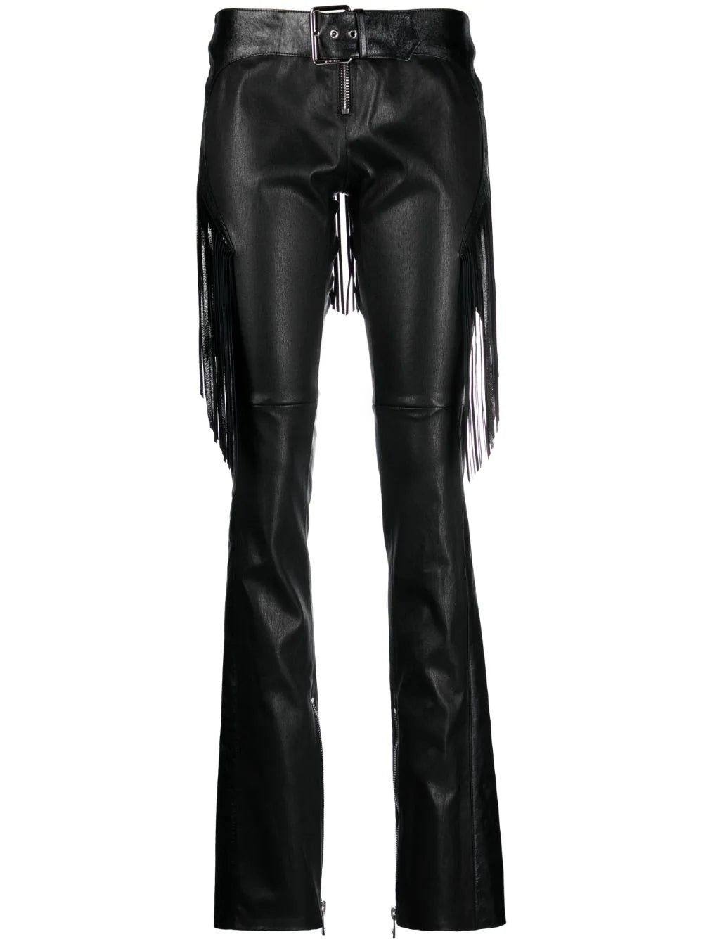 Made in Italy from supple lambskin, these black boot-cut trousers from Versace feature a buckle-fastening waist and fringed detailing for a Western-inspired look.