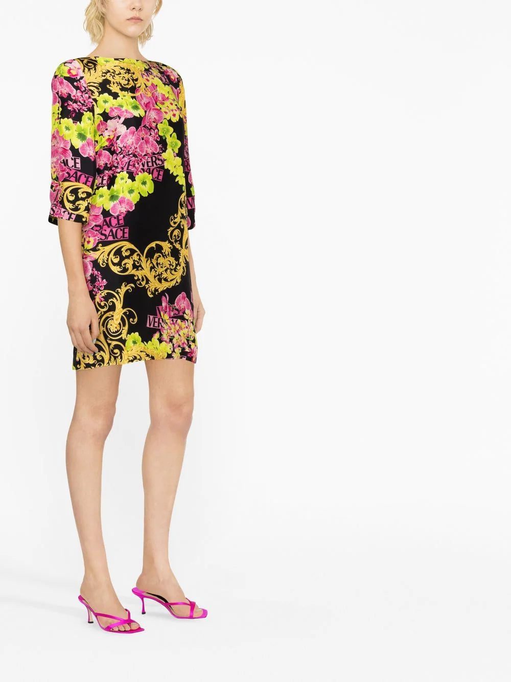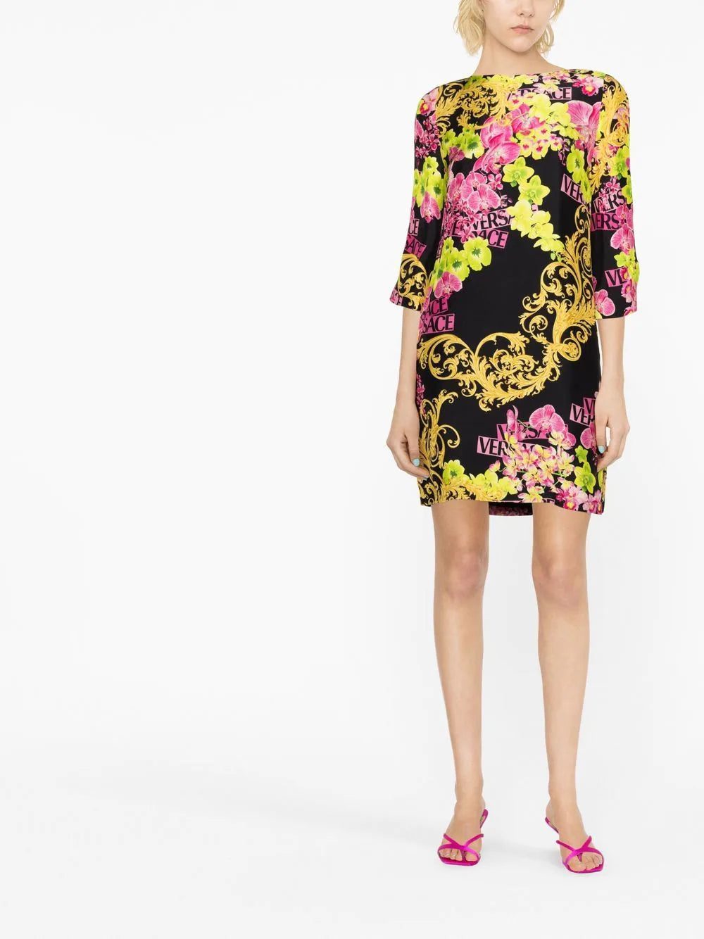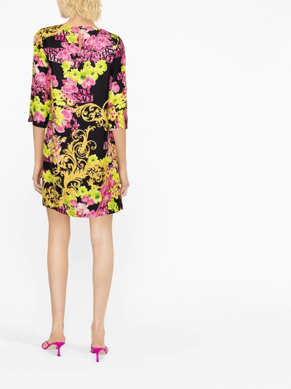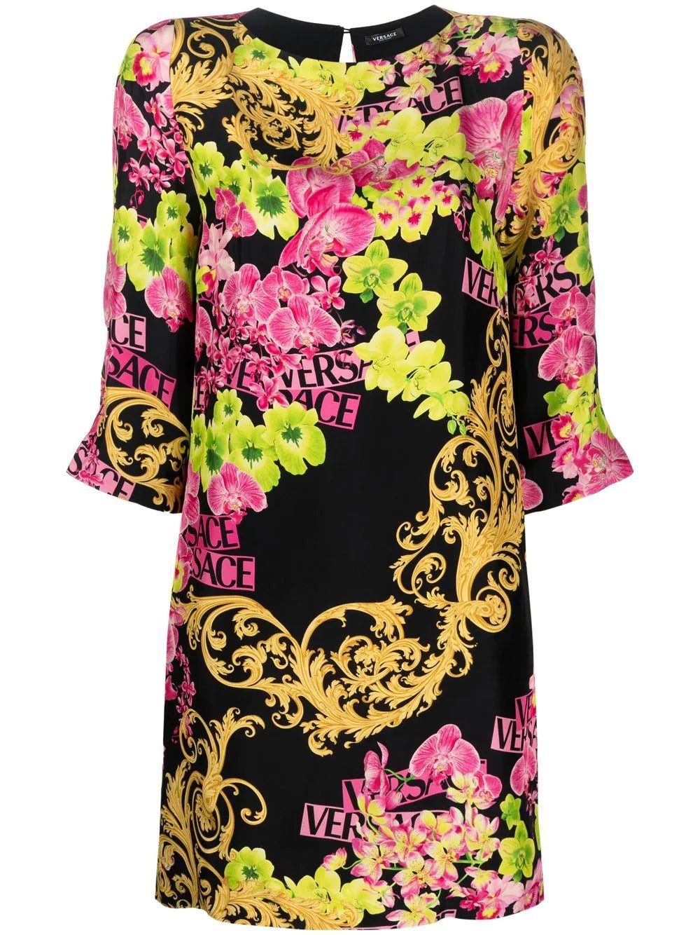 Versace's bold approach to opulence is showcased on this long-sleeve dress. Constructed from silk, the garment features a bright floral print and the signature baroque pattern.