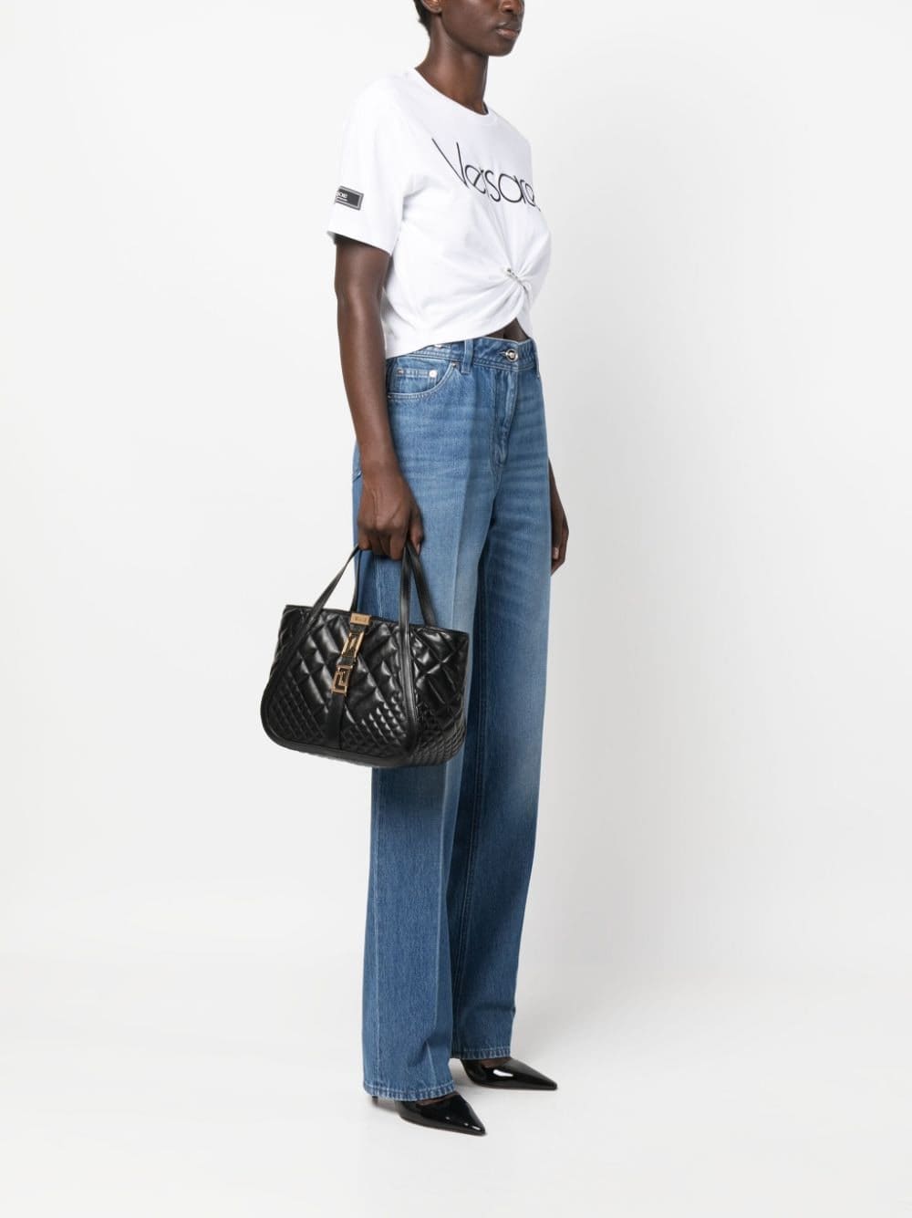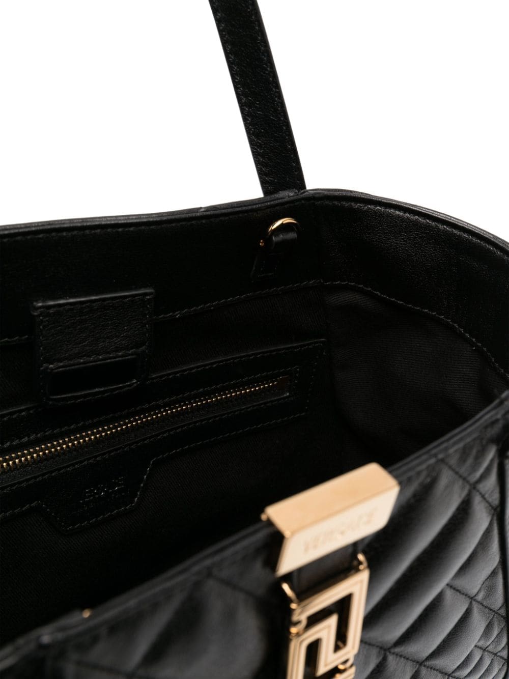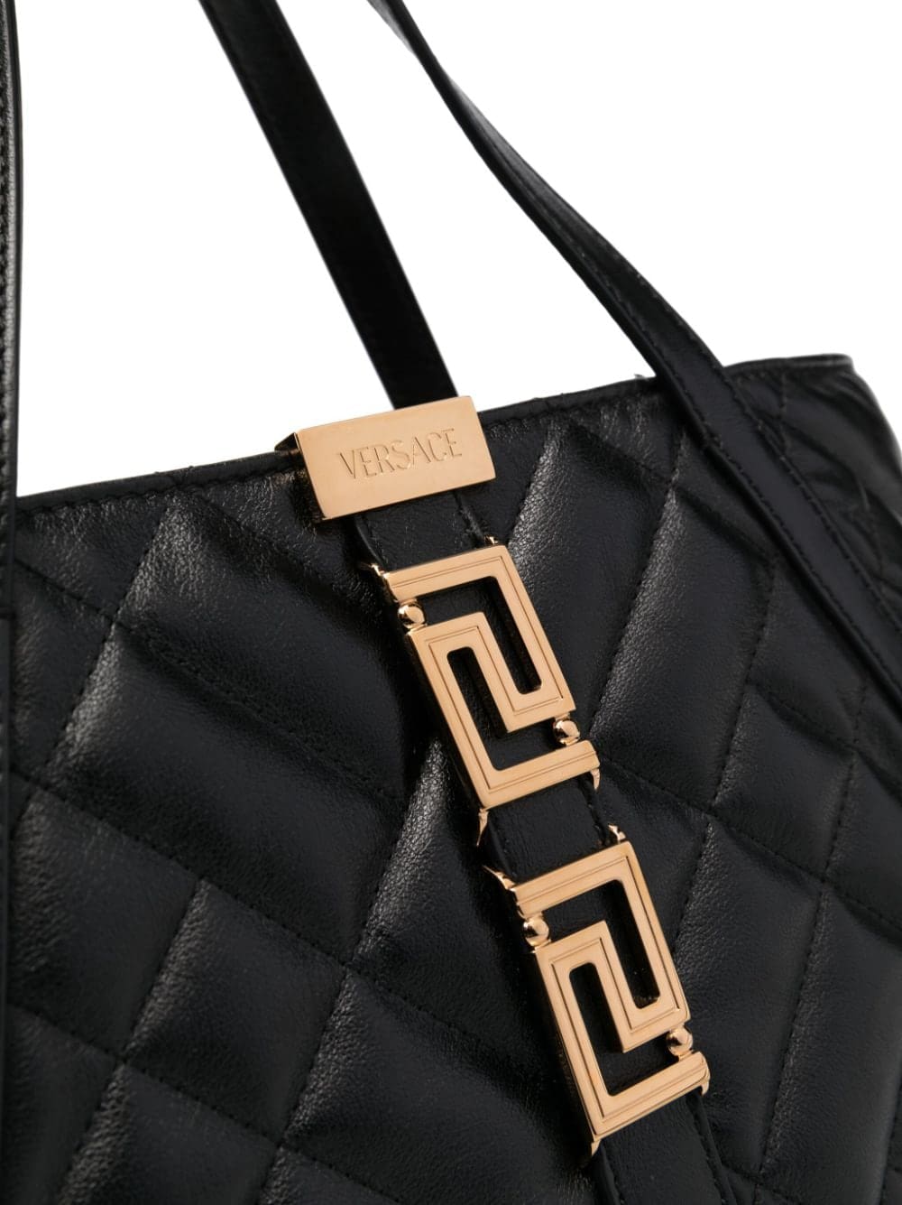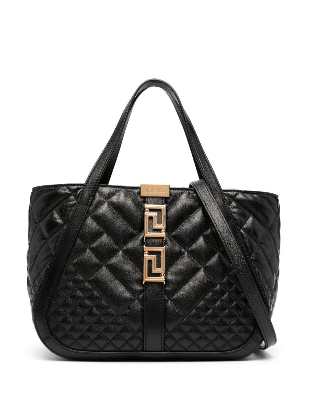 Versace's Greca Goddess collection is defined by the iconic, geometric Greca chain. Part of the line, this tote bag is crafted from quilted leather and detailed with signature gold-tone hardware. The detachable shoulder strap and two top handles allow for versatile styling.