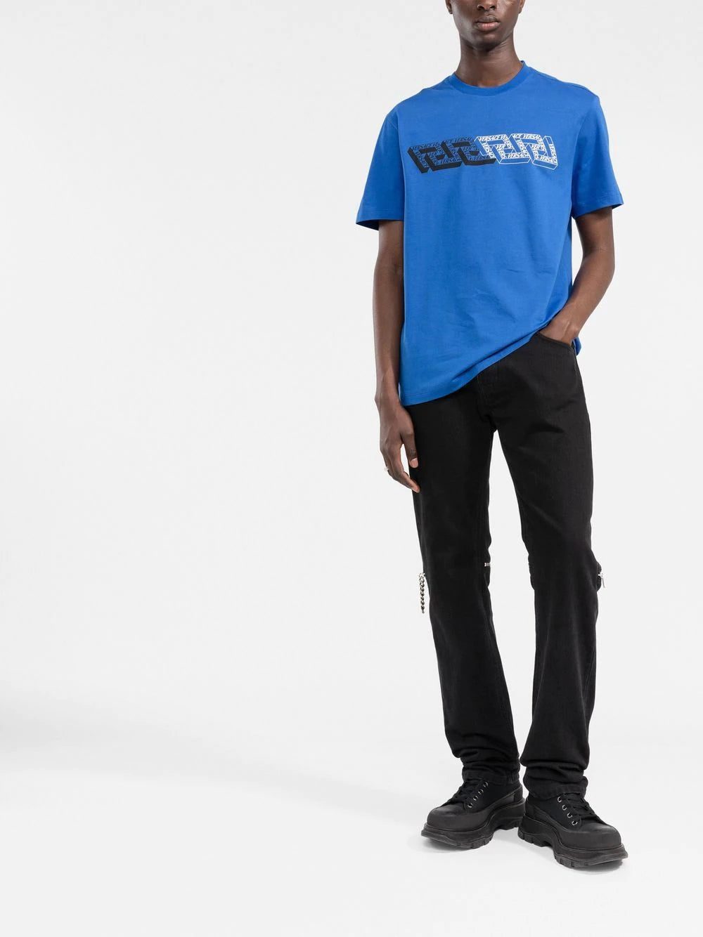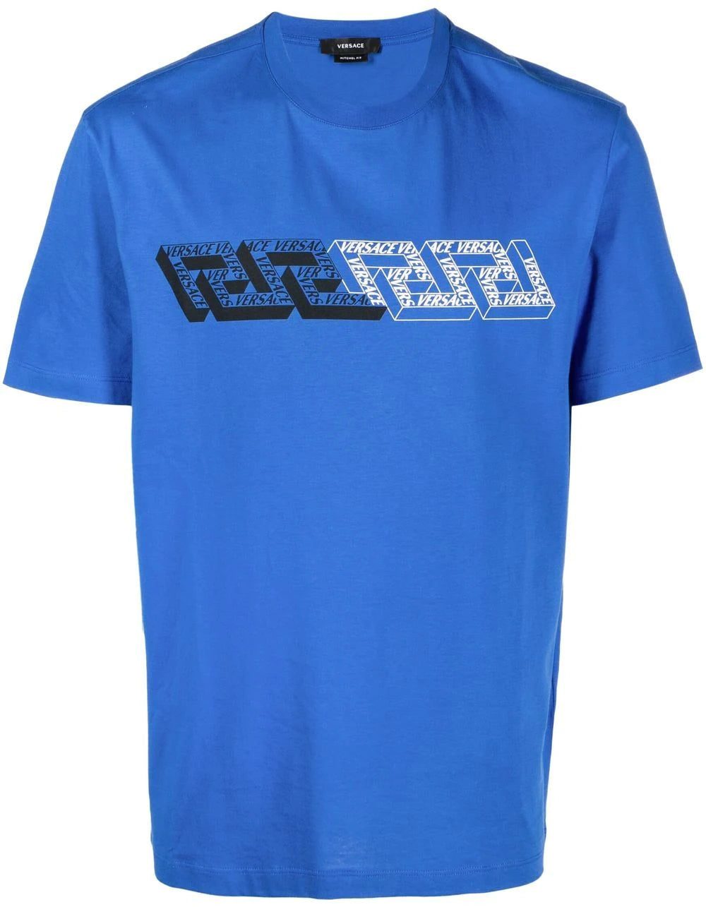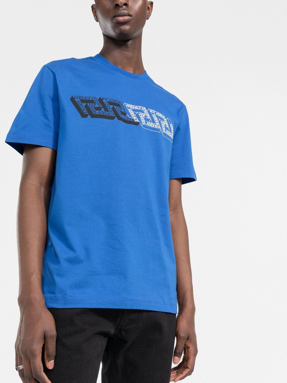 Reworked into a 3D version, Versace’s iconic Greca motif appears printed to the front of this T-shirt. For an unmistakable look, the geometric theme is complemented with multiple printed logos.
