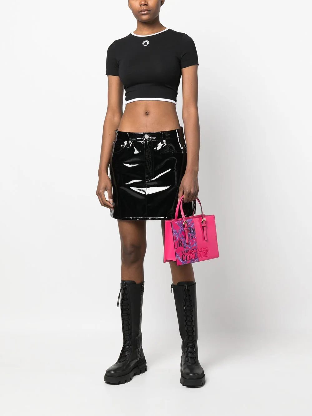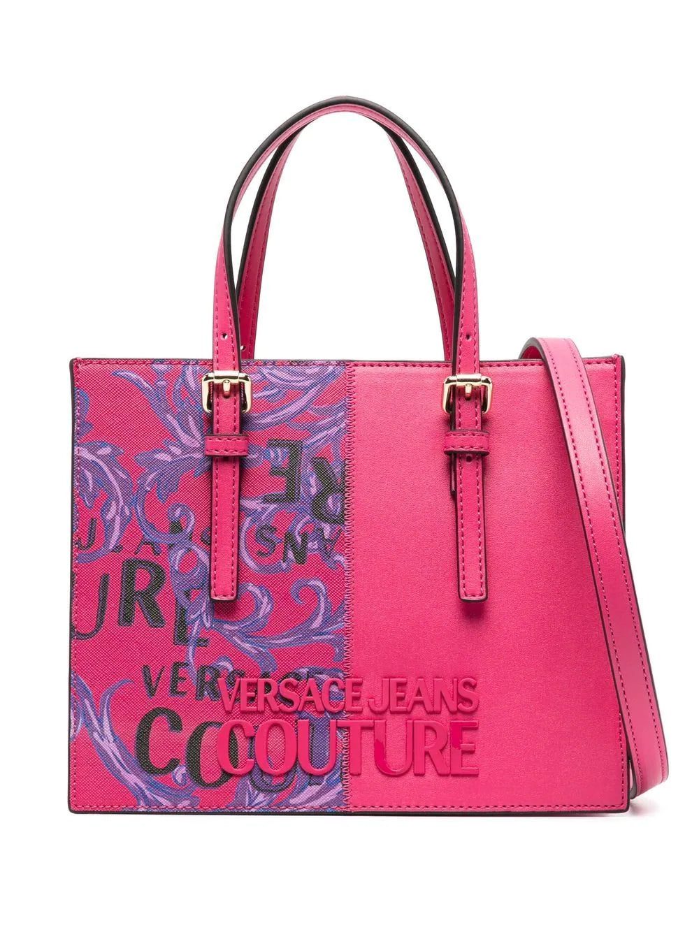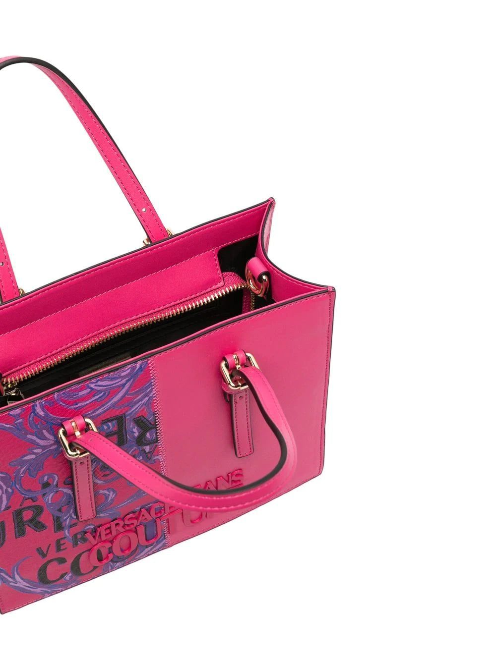 Defined by its structured main compartment, this hot pink tote by VERSACE JEANS COUTURE is infused with the house's heritage and penchant for bold motifs as shown by a Barocco print detail at the front.