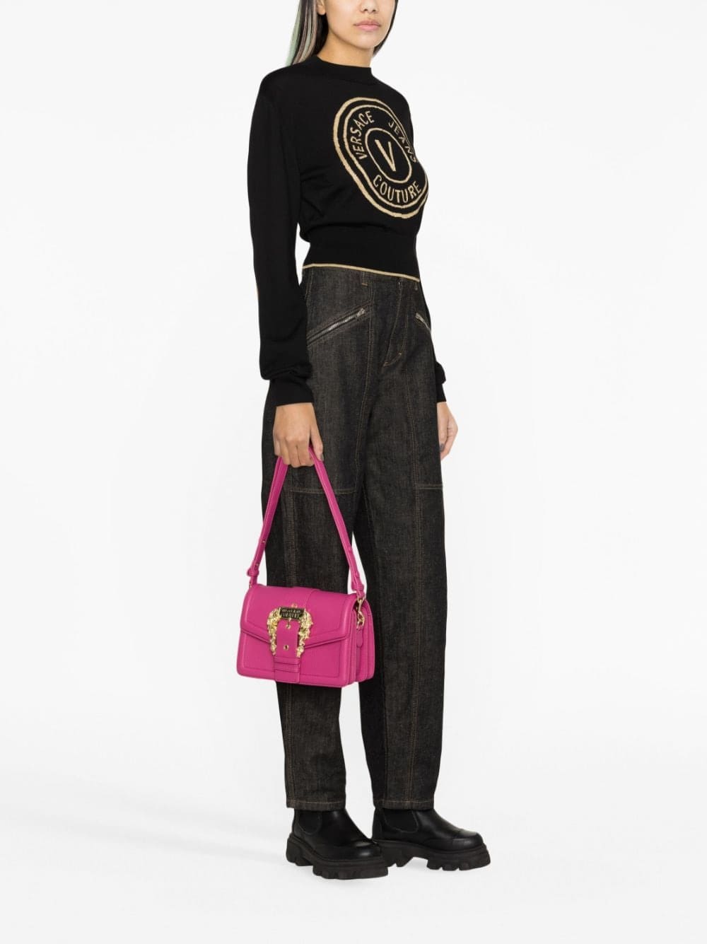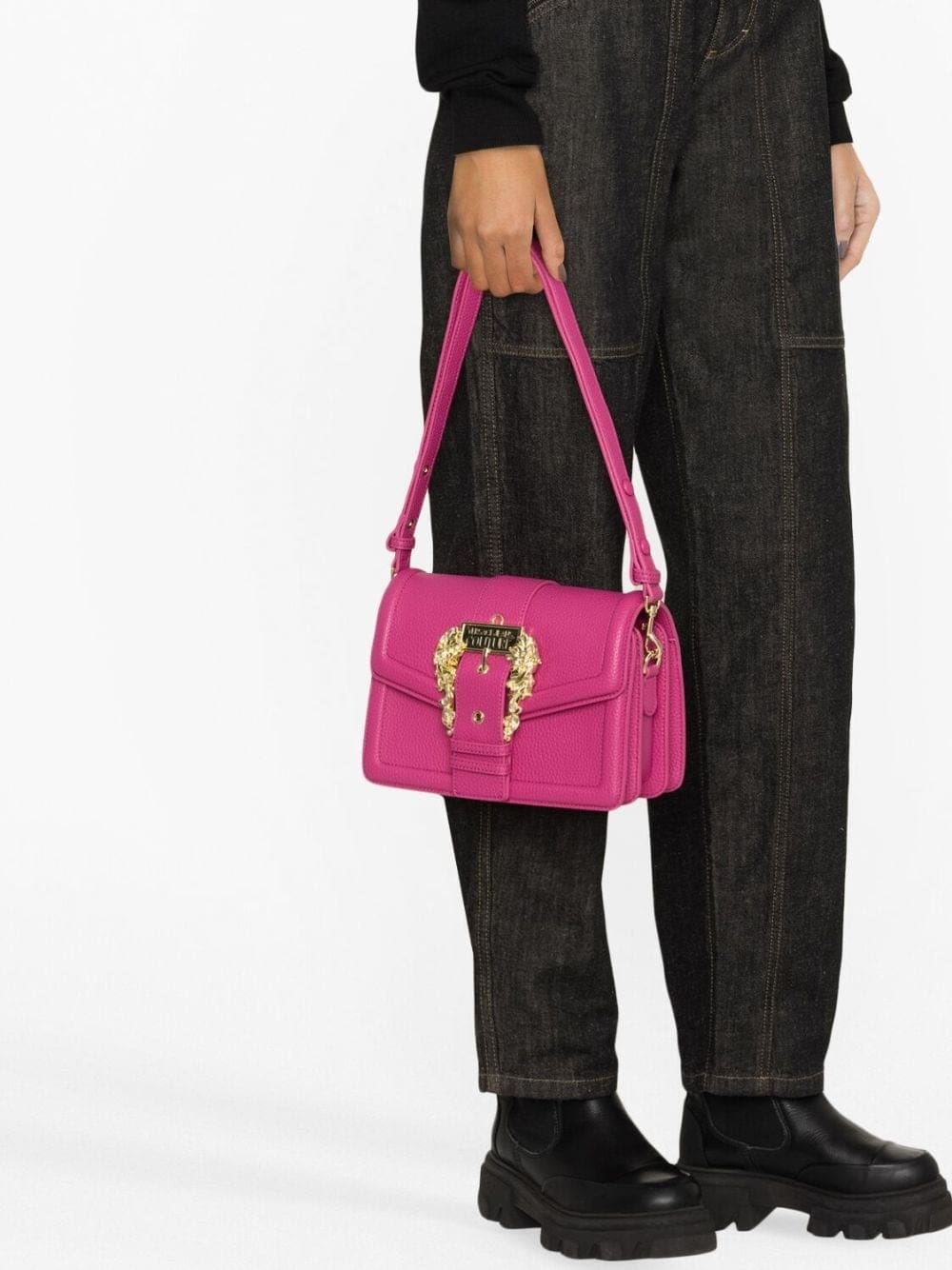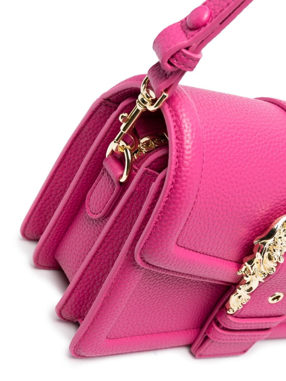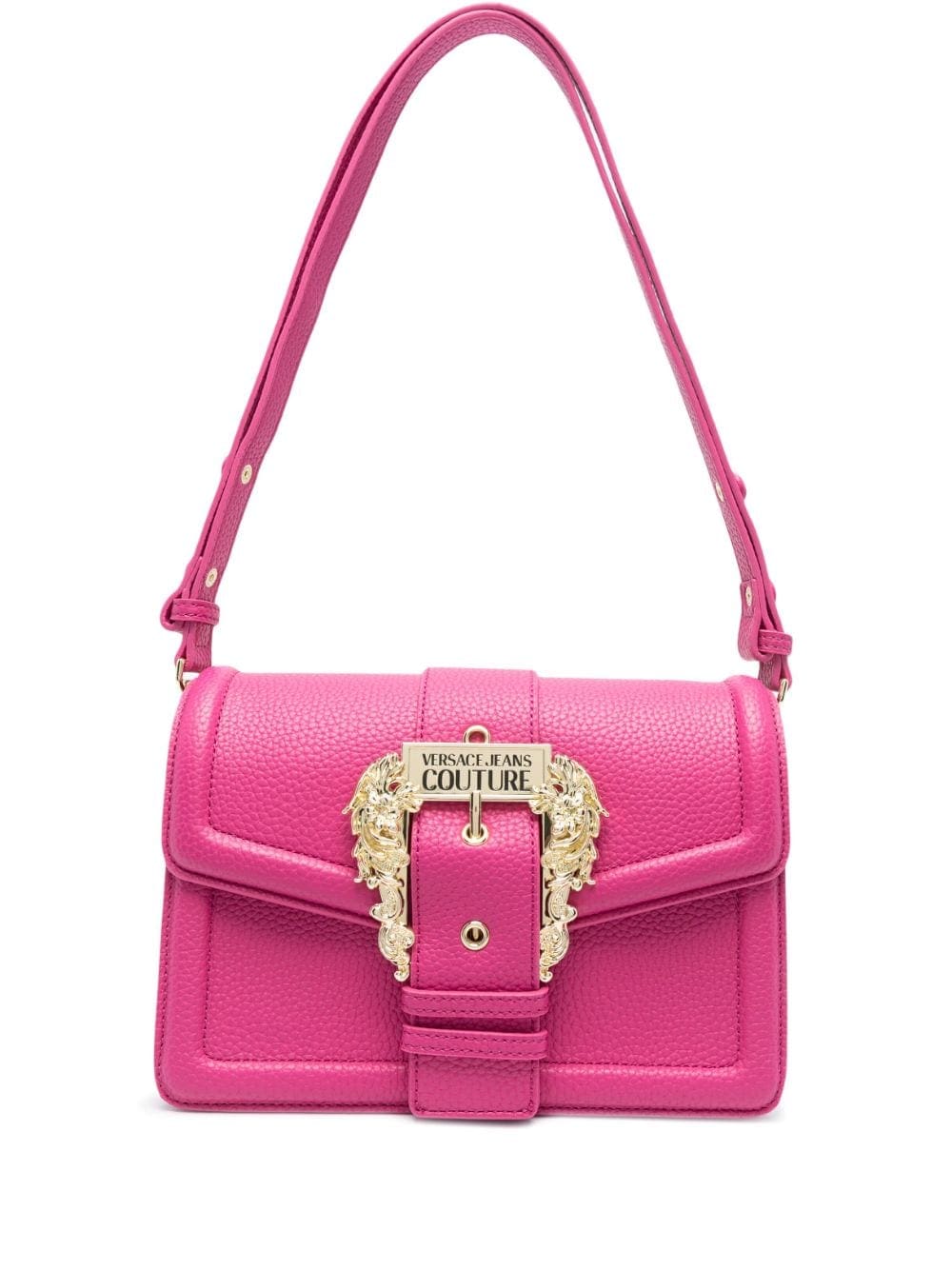 Versace Jeans Couture showcases its branding-focused aesthetic with this crossbody bag. Crafted from crimson-pink faux leather, this design is defined by a gold-tone logo plaque and Baroque buckle to the front, making this bag instantly recognisable.