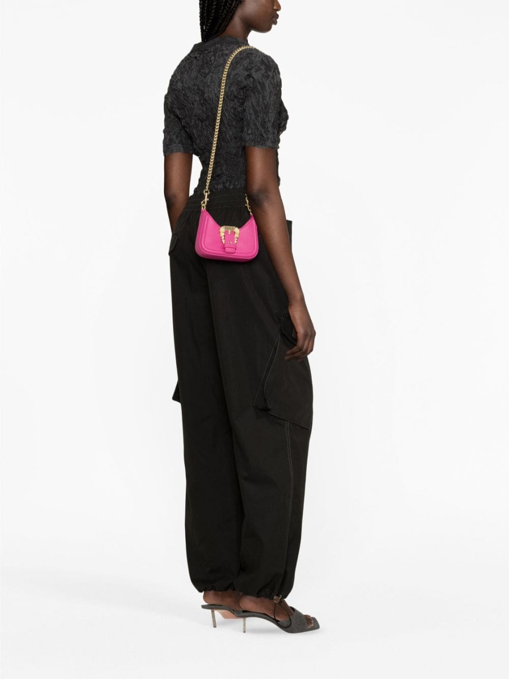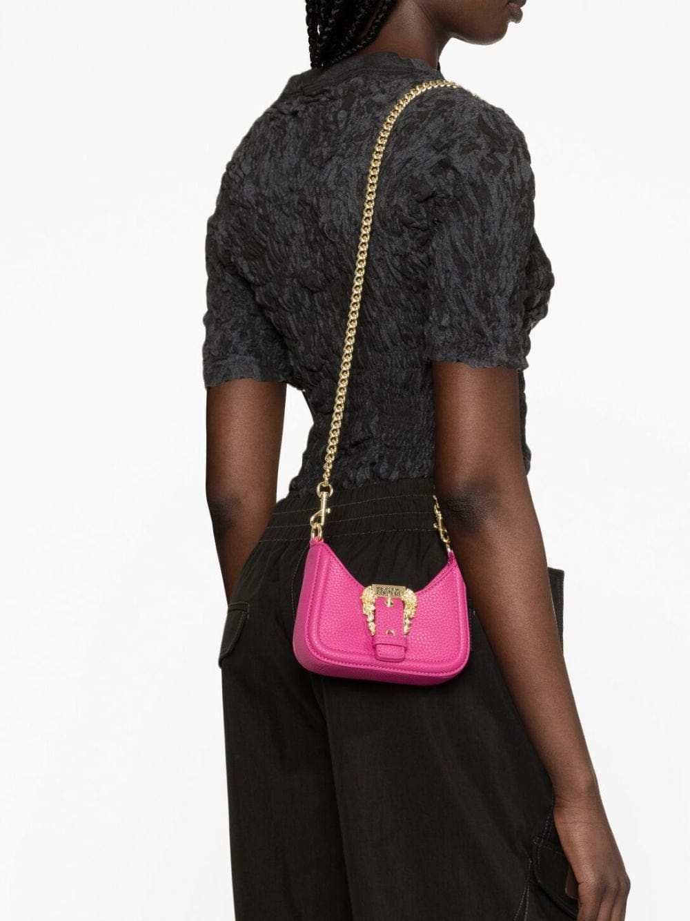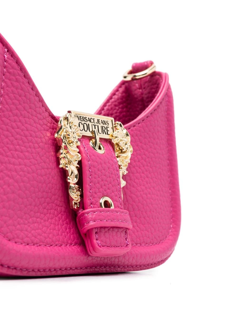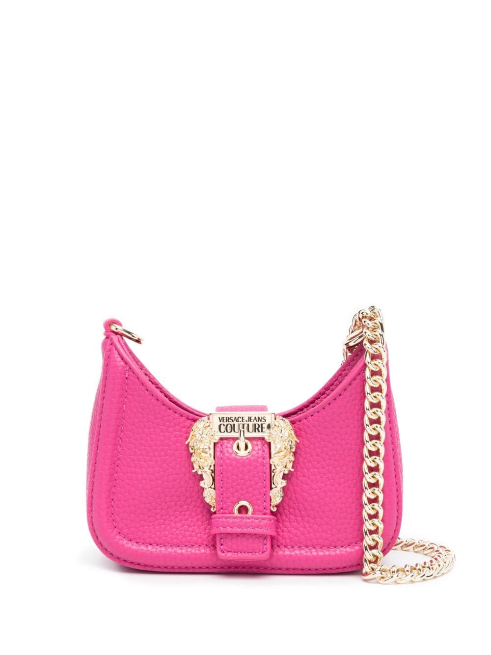 Versace Jeans Couture is as synonymous with bold detailing as its mainline counterpart, as exemplified by the gold-tone Baroque logo buckle on this crossbody bag. The mini crescent silhouette is crafted from faux leather with a durable pebbled finish and suspends from a gilded chain-link shoulder strap.