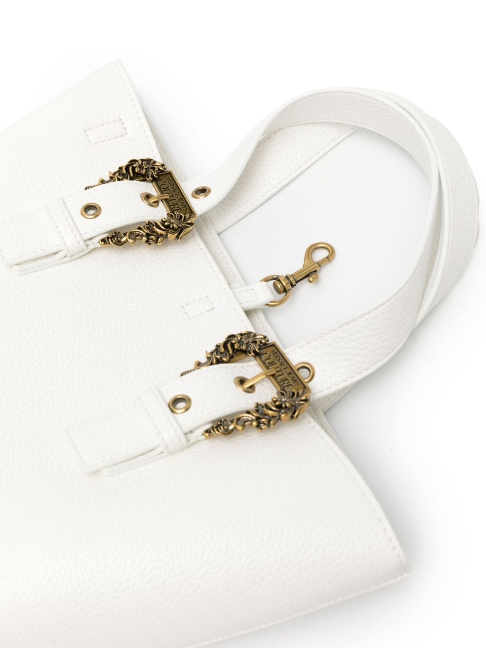 Metallic accents imbue Versace Jeans Couture's designs with signature high-octane energy, and this white tote bag is no exception. Made from grained faux leather, it boasts an ample silhouette punctuated by two Baroque buckles, adding an intricate, unmistakable touch. It features two top handles and an adjustable, detachable strap to allow hand or shoulder carrying.