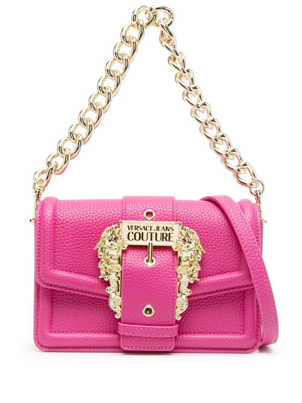 baroque-buckle shoulder bag from VERSACE JEANS COUTURE featuring fuchsia pink, faux leather, grained texture, gold-tone hardware, baroque pearl, internal logo plaque, foldover top with magnetic fastening, chain-link shoulder strap, adjustable detachable shoulder strap and main compartment.