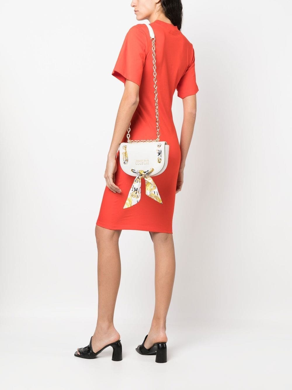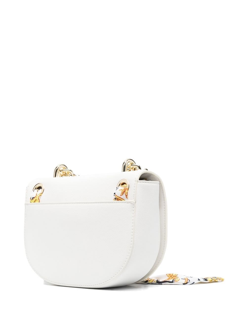 white faux leather grained texture gold-tone logo lettering internal logo plaque baroque-pattern print faux-leather and chain-link shoulder strap main compartment