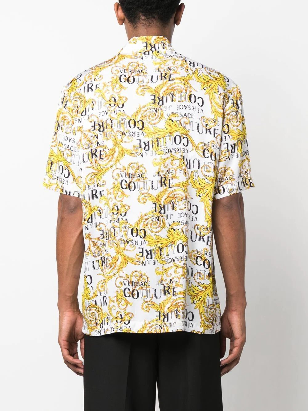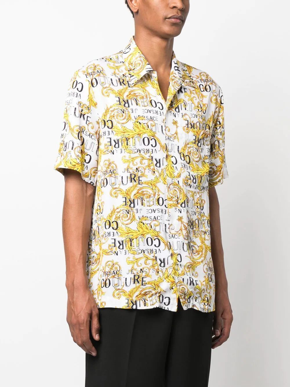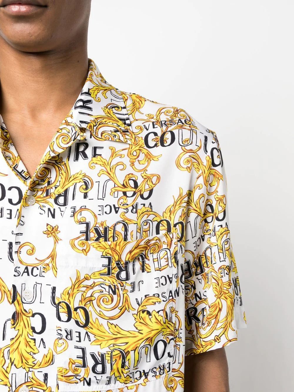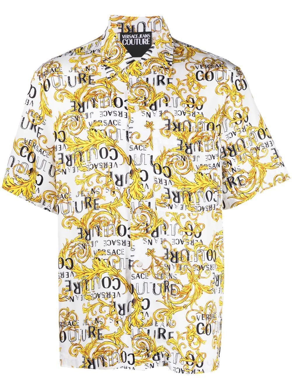 baroque-print short-sleeve shirt from VERSACE JEANS COUTURE featuring white, baroque-pattern print, all-over logo print, classic collar, front button fastening, short sleeves, chest patch pocket and straight hem.