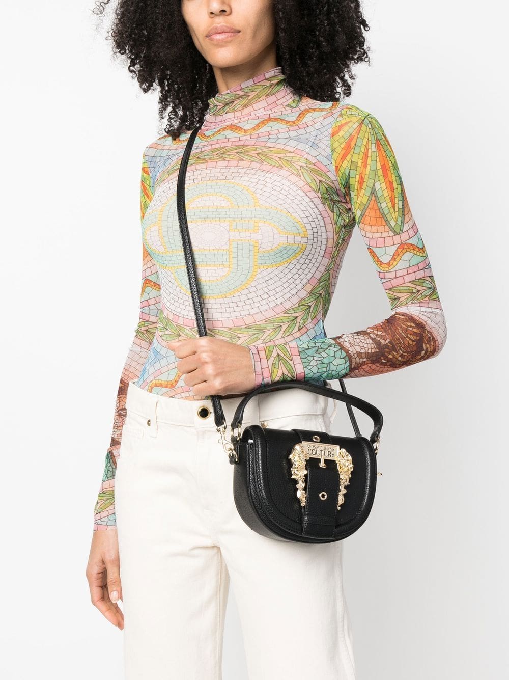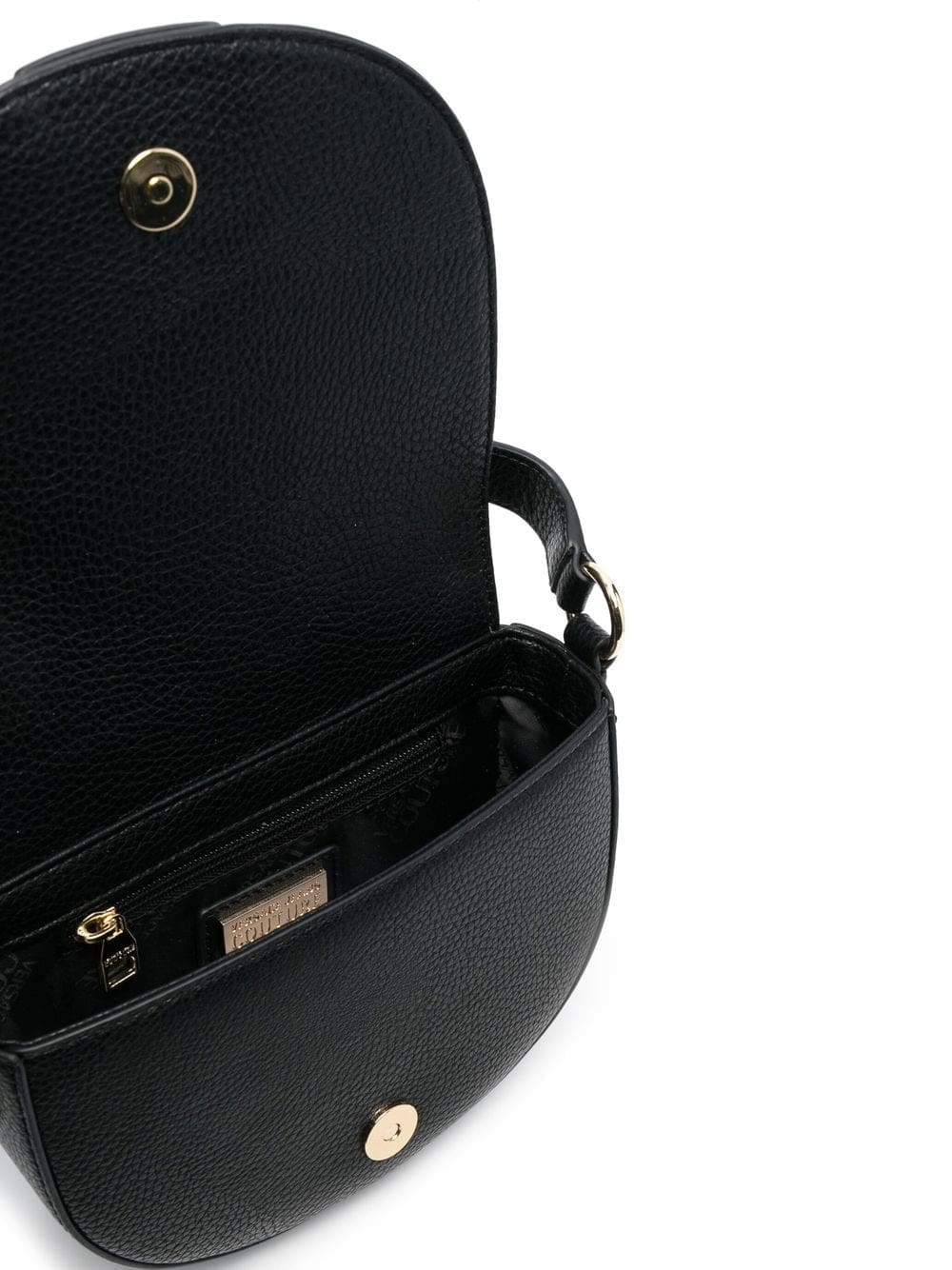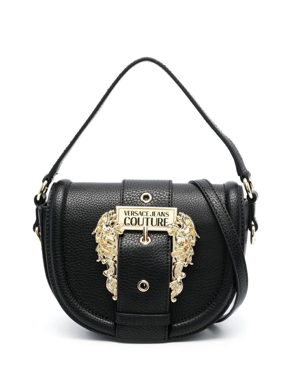 black decorative buckle detail engraved logo single shoulder strap single flat top handle main compartment