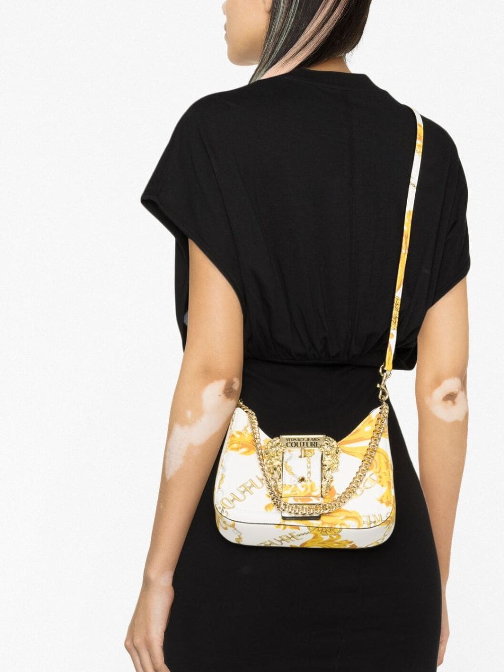 Versace Jeans Couture spotlights its enduring house codes with this crossbody bag. The curved faux-leather construction plays host to a signature Chain Couture print and gold-tone Baroque buckle.