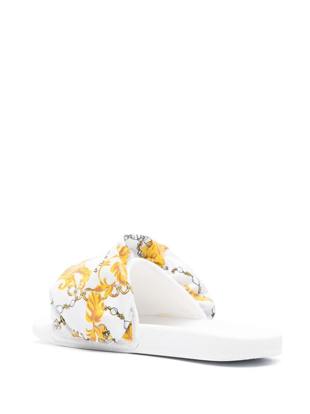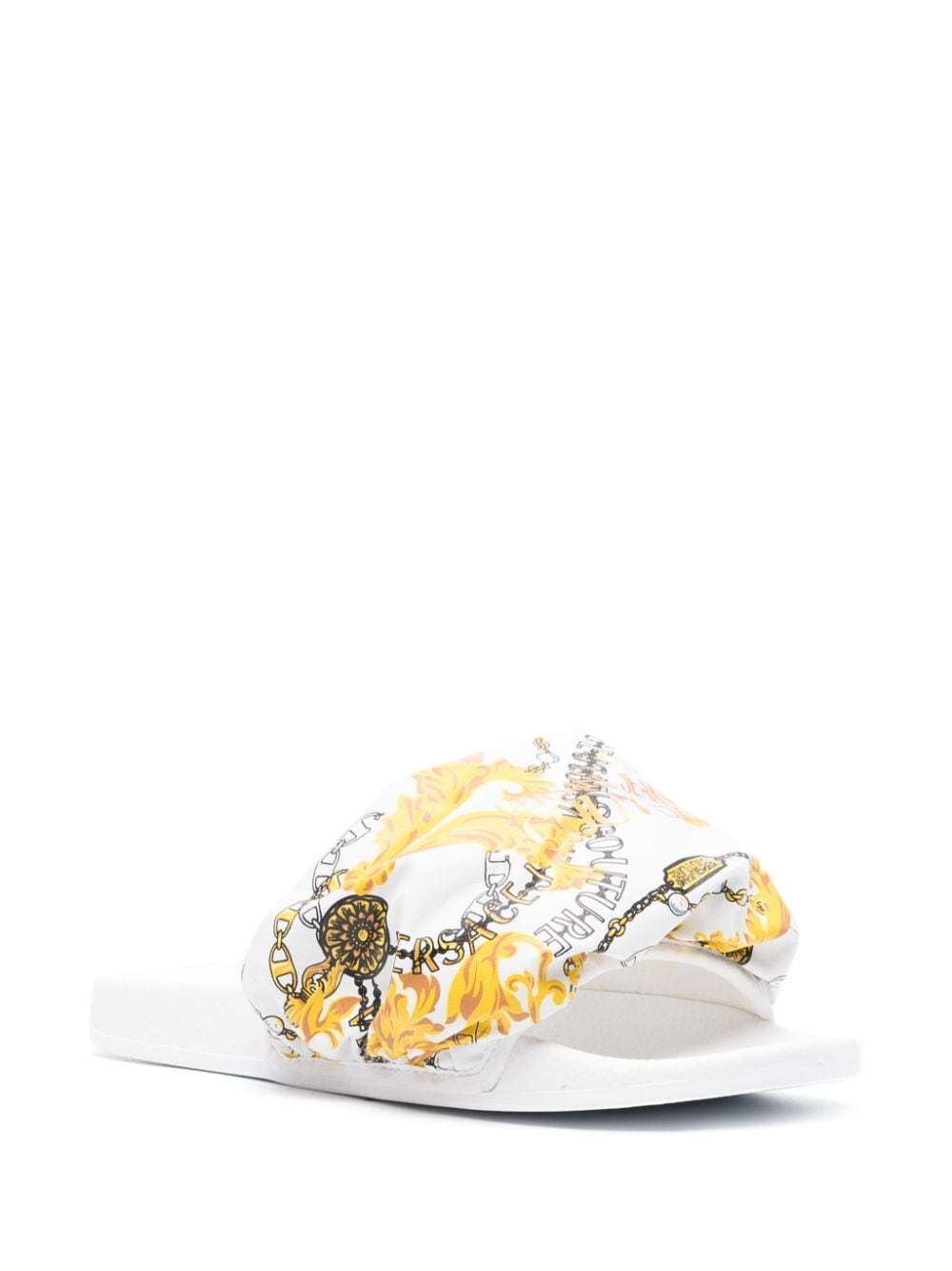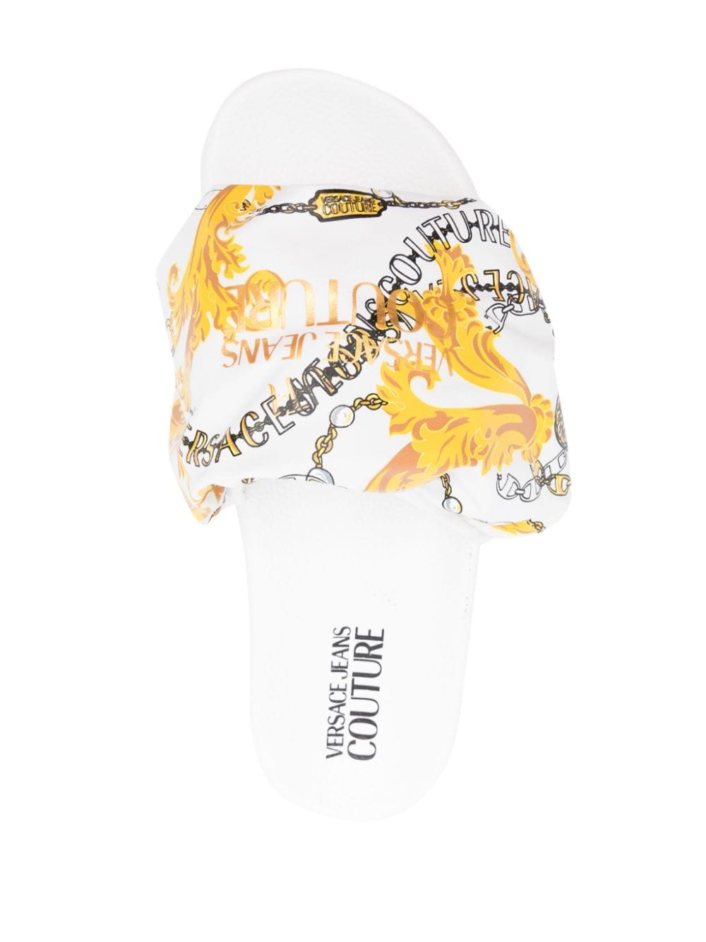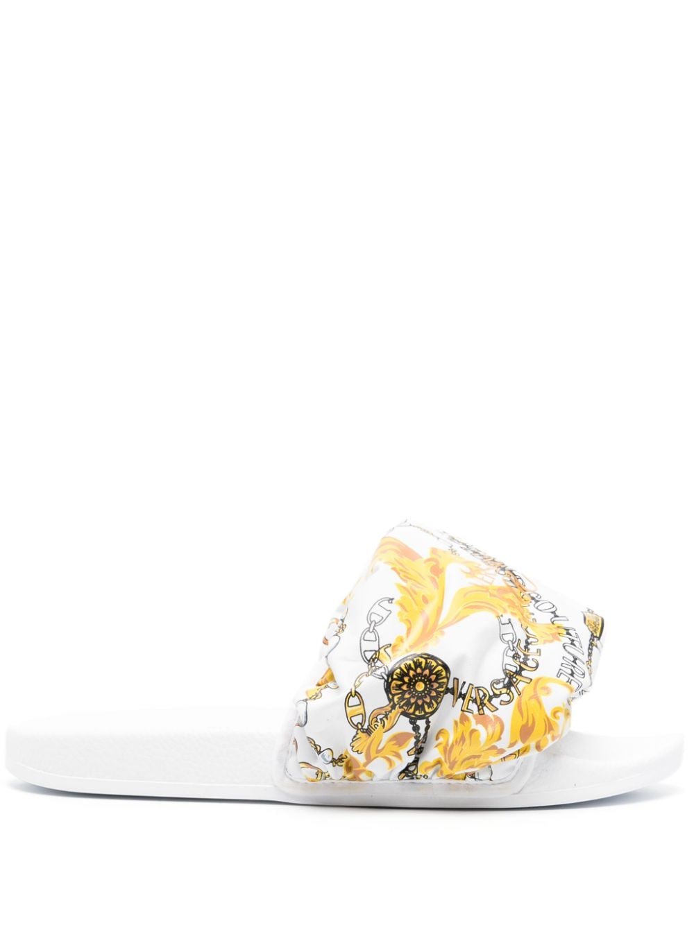 Boasting a slip-on, padded upper, these Versace Jeans Couture slides are decorated with the brand's signature Chain Couture print in white and golden hues for a distinctive finish.