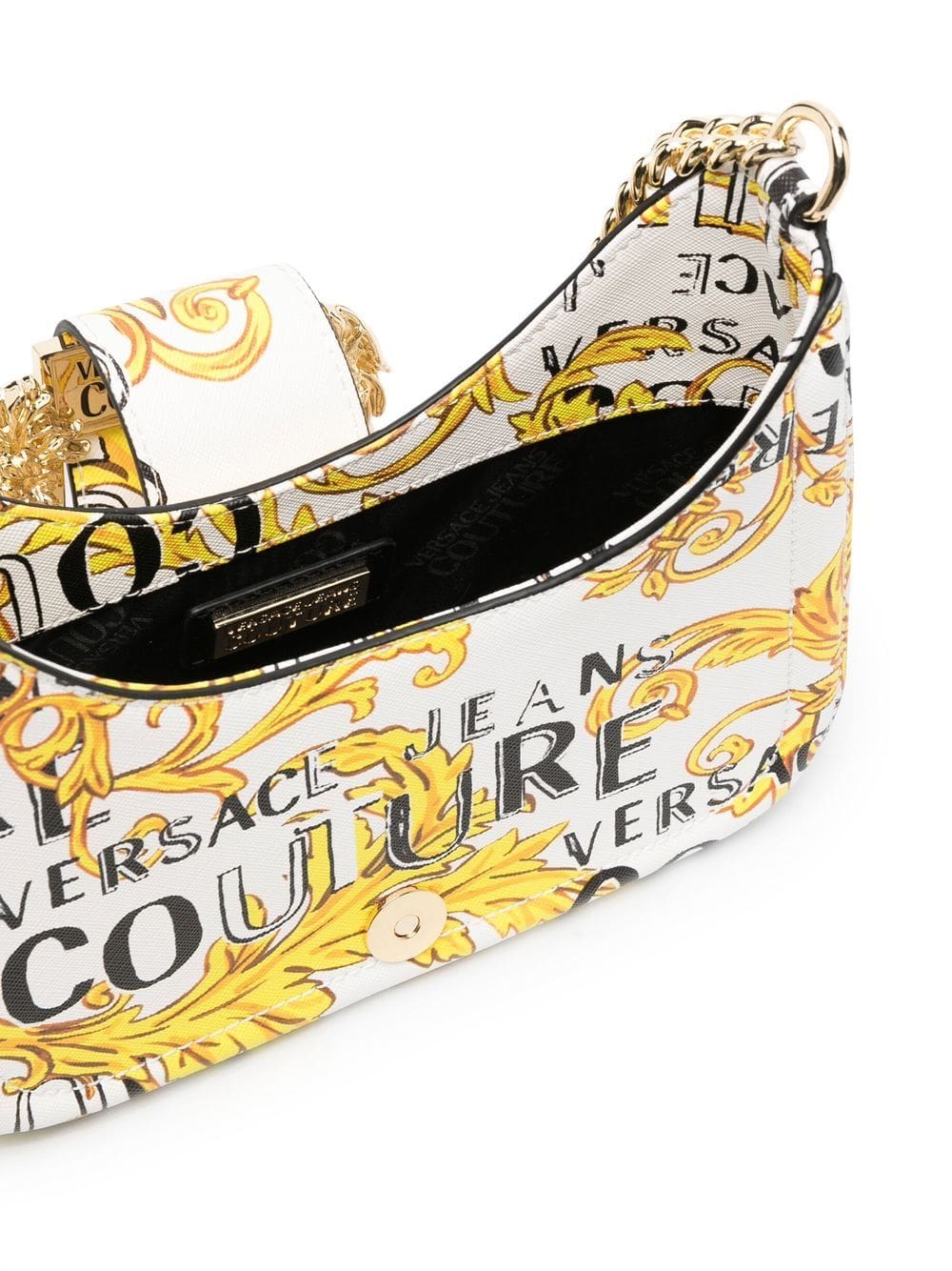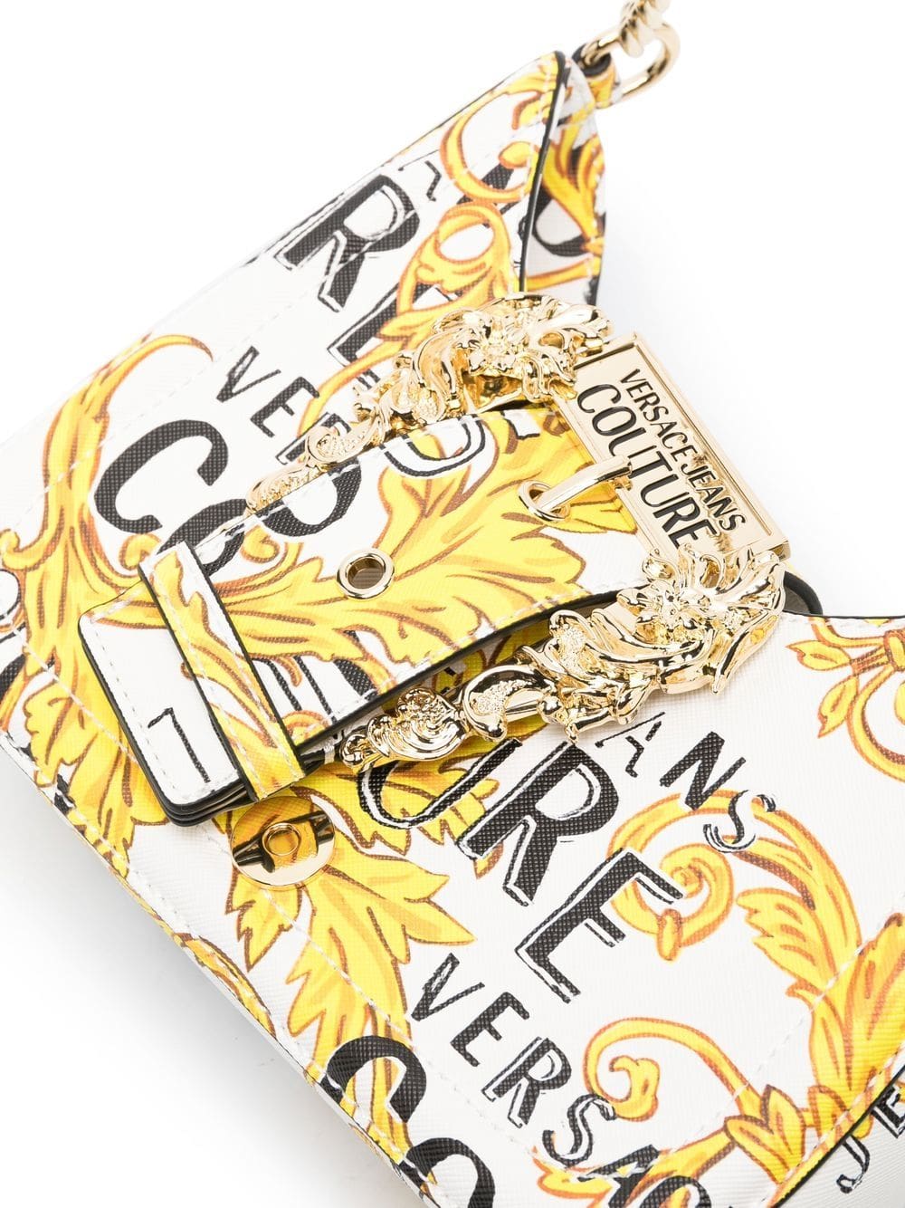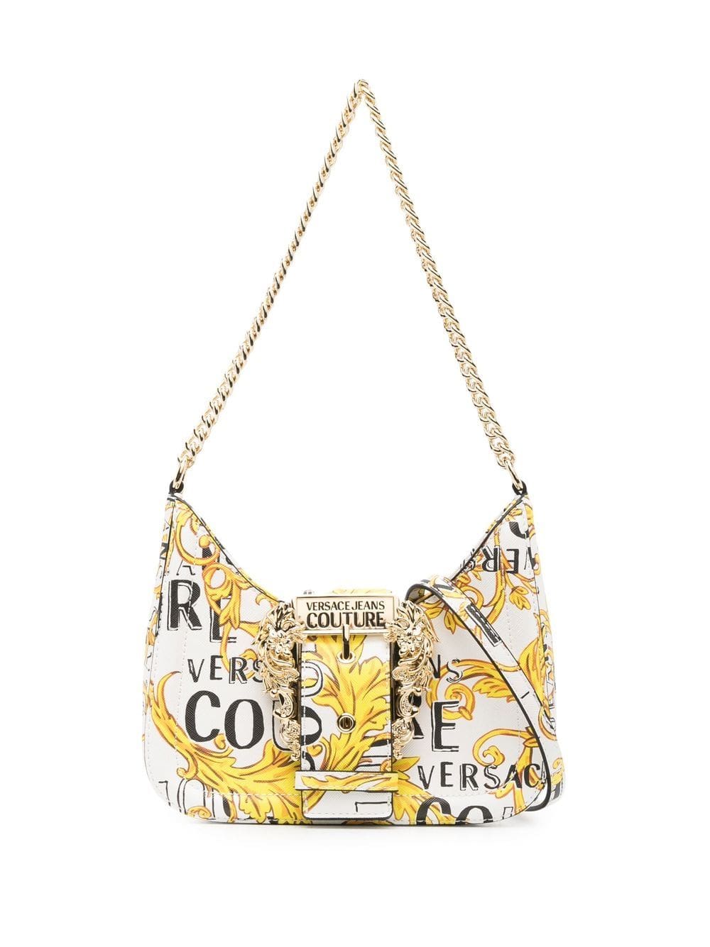 Showing the brand's bold signature style, this shoulder bag from Versace Jeans Couture is decorated with a Logo Couture print and a Baroque buckle at the front. This piece is crafted from faux leather, in white, and features a gold-tone chain link shoulder strap.