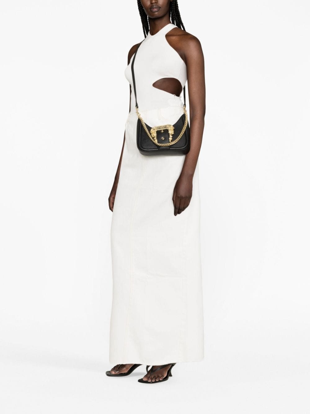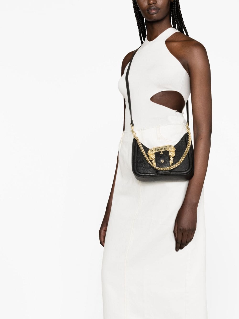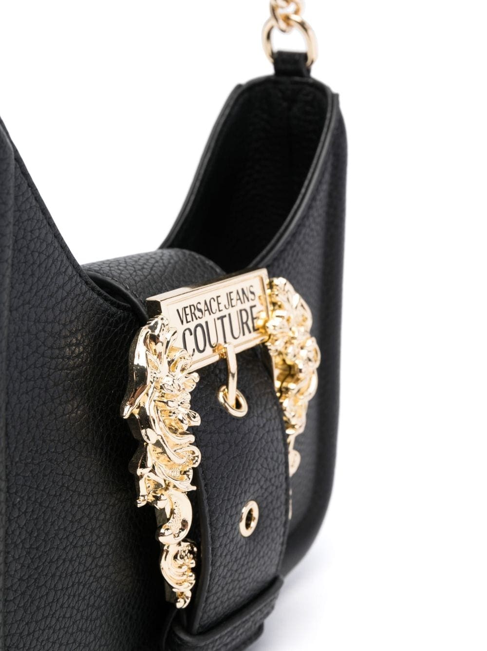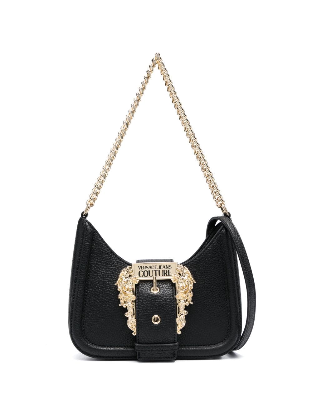 This Versace Jeans Couture shoulder bag is defined by the gold-tone Baroque buckle from the Couture 1 line. It's engraved with the brand's logo lending the piece a strong opulent and polished feel.