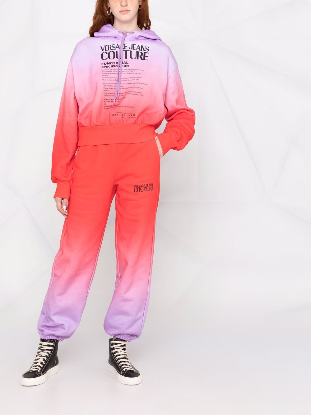 Founded by Gianni and Donatella Versace, Italian brand Versace Jeans Couture combines high fashion and street style for a youthful aesthetic. Made from soft cotton, this relaxed pair of track pants is defined by its gradient effect that transitions from red to purple. A logo print at the leg completes the design.