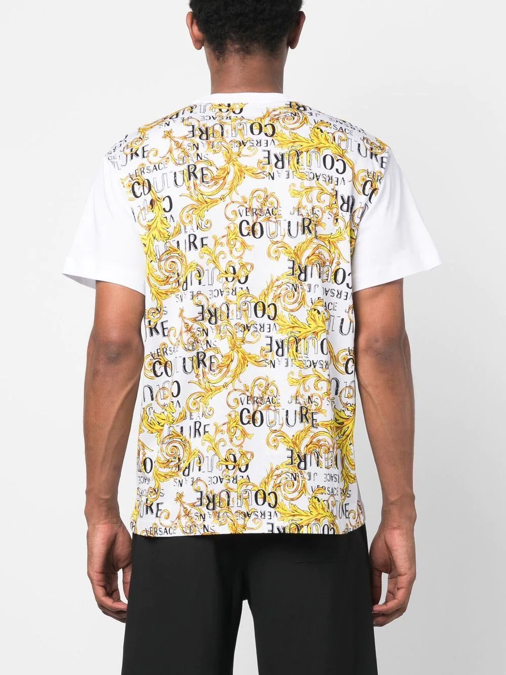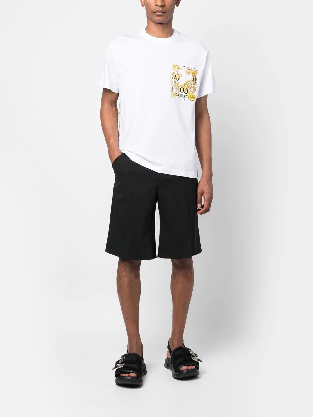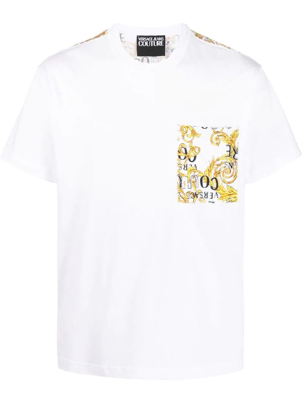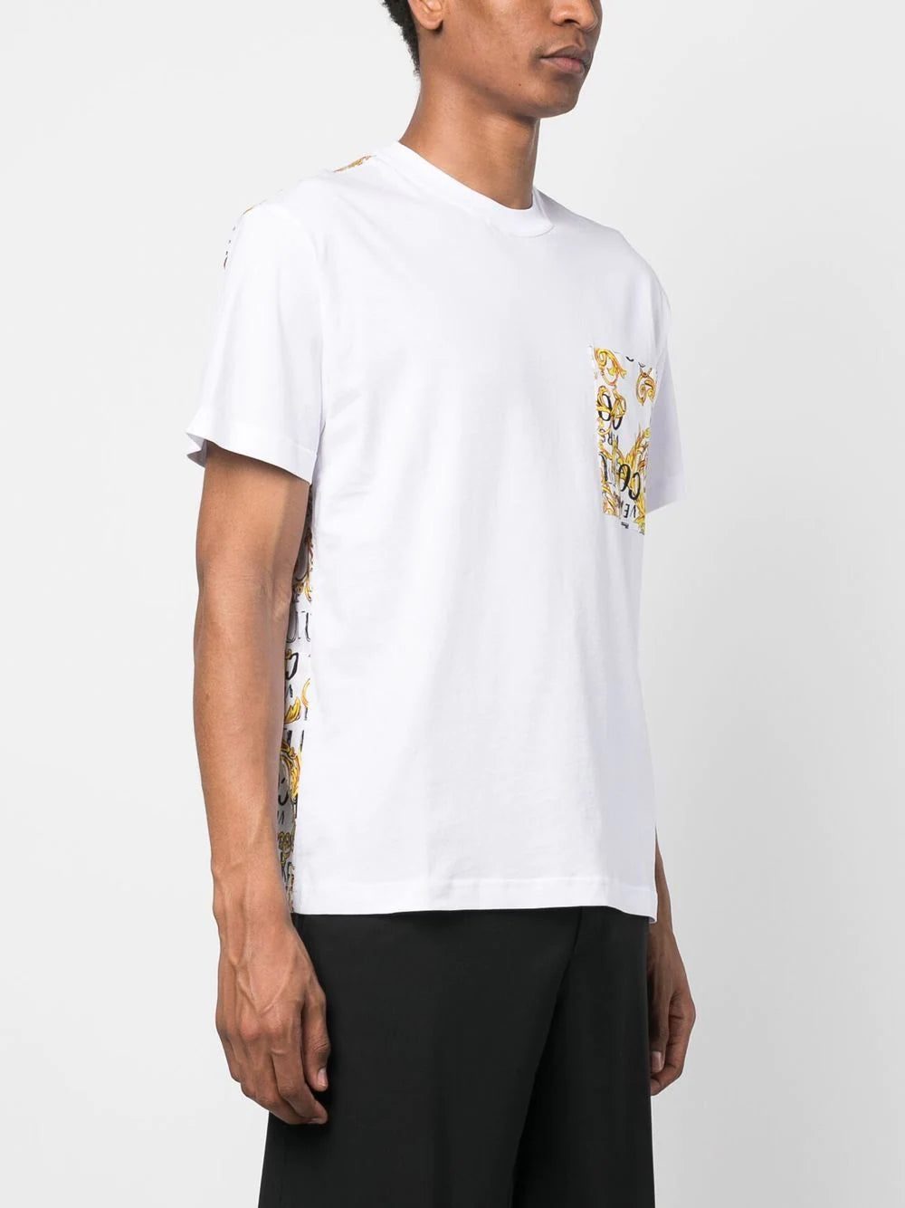 Logo Couture contrasting T-shirt from VERSACE JEANS COUTURE featuring white, cotton, signature Baroccoflage print, contrasting panel detail, crew neck, short sleeves, chest patch pocket and straight hem.