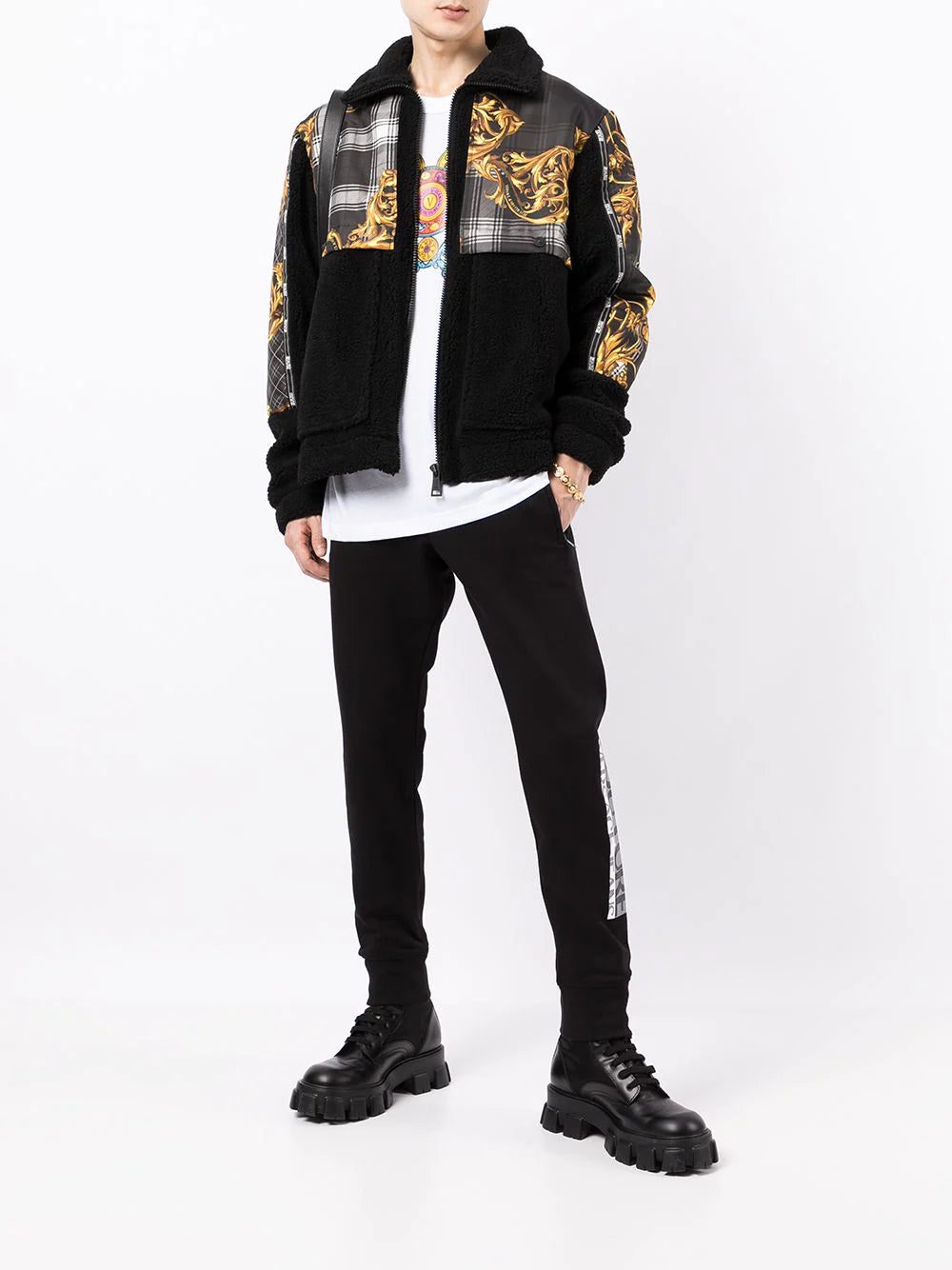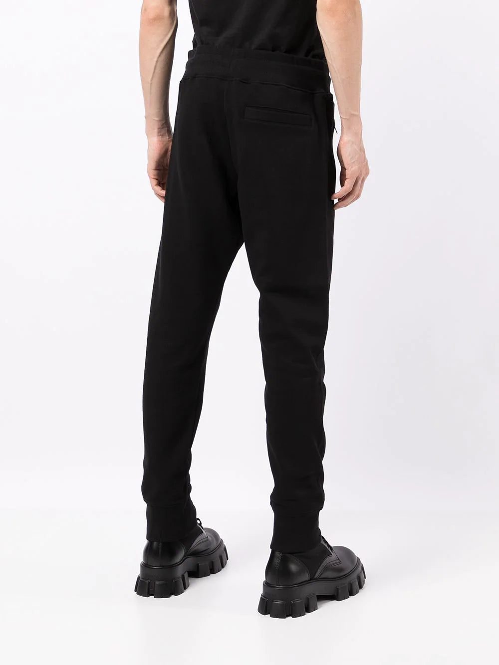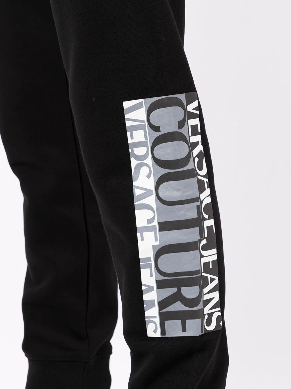 Black cotton logo-leg cotton trackpants from VERSACE JEANS COUTURE featuring jersey fleece, logo print at the leg, elasticated drawstring waistband, slim cut, two side zip-fastening pockets, rear welt pocket and elasticated ankles.