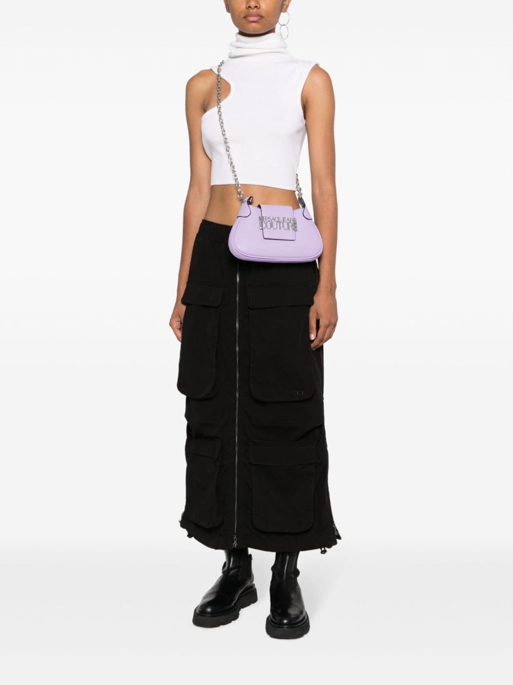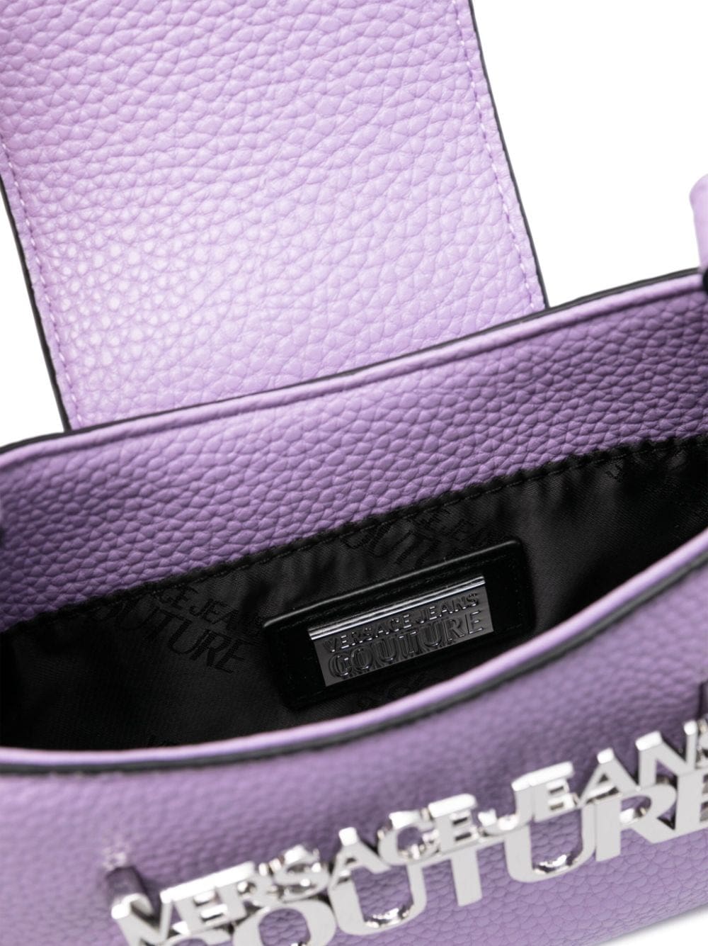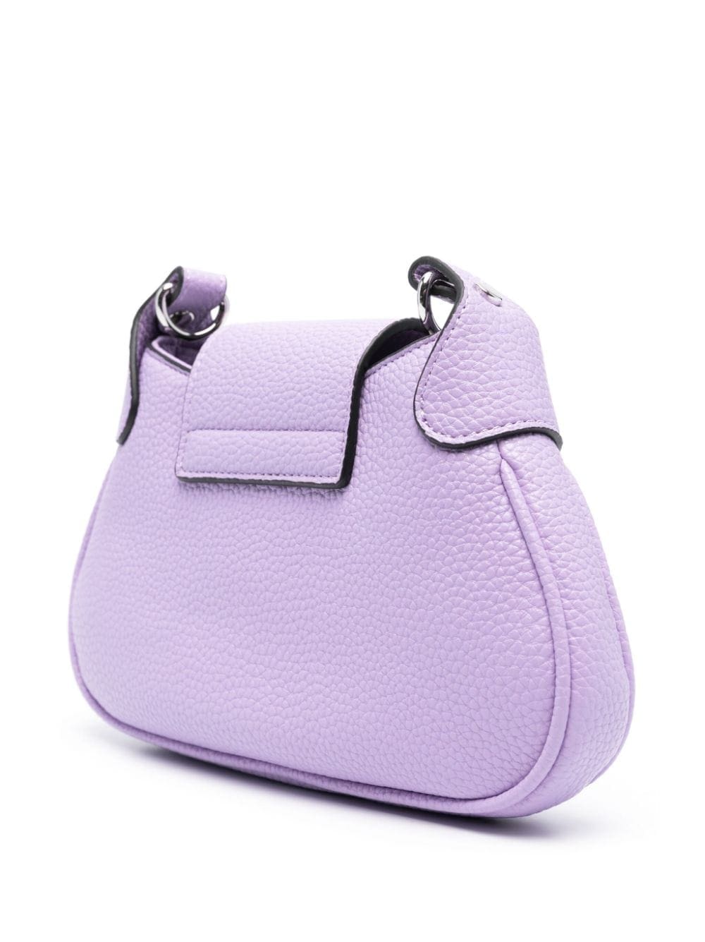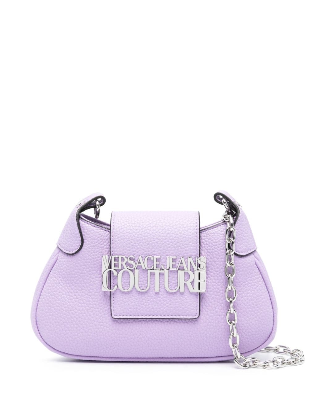 This Versace Jeans Couture bag is crafted in lilac faux leather with a durable grained finish. The silver-tone logo plaque at the front secures the top flap fastening in both both decorative and functional detail.