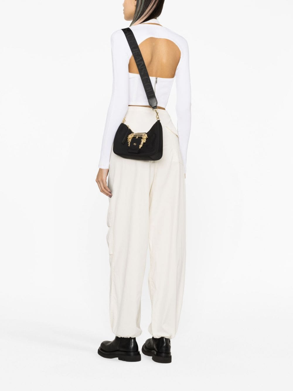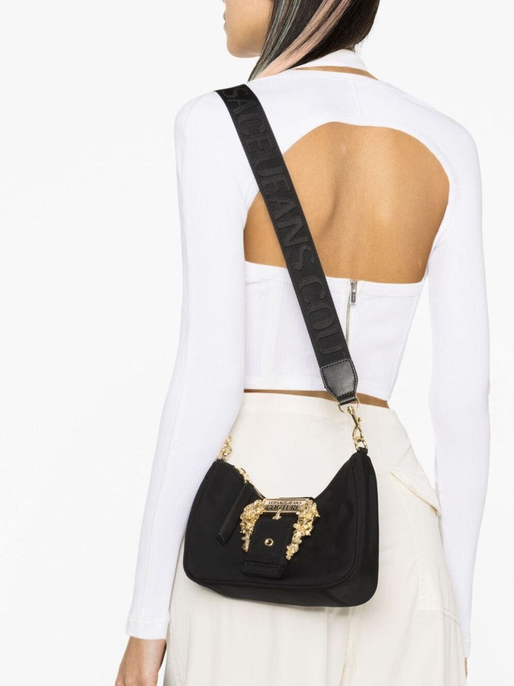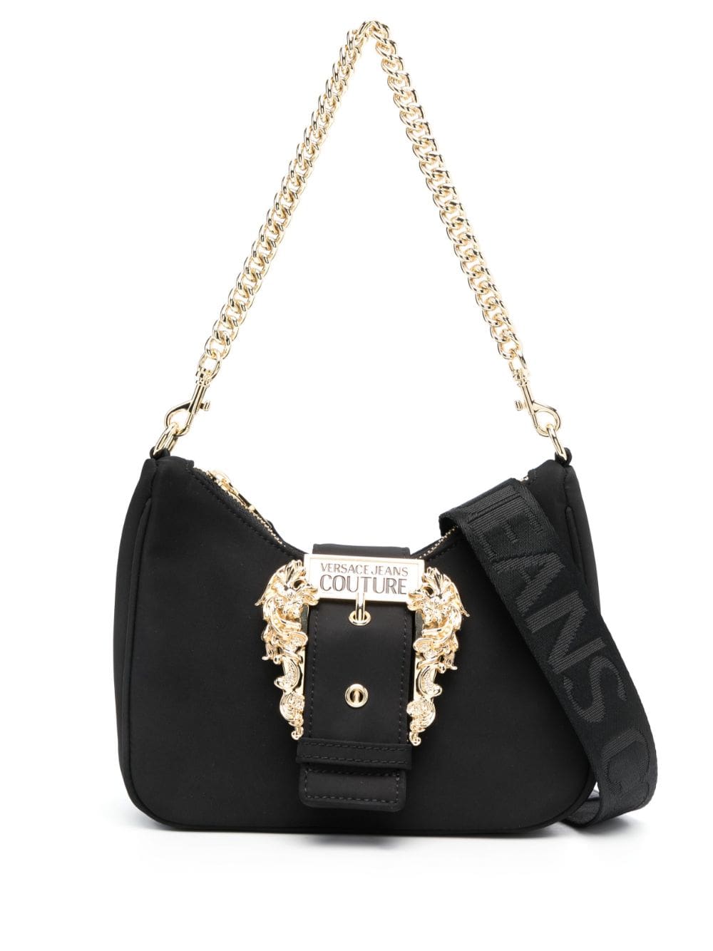 Versace Jeans Couture showcases its branding-focused aesthetic with this crossbody bag. Imagined in black faux leather, this design is defined by the signature gold-tone Baroque buckle to the front, making this bag instantly recognisable.